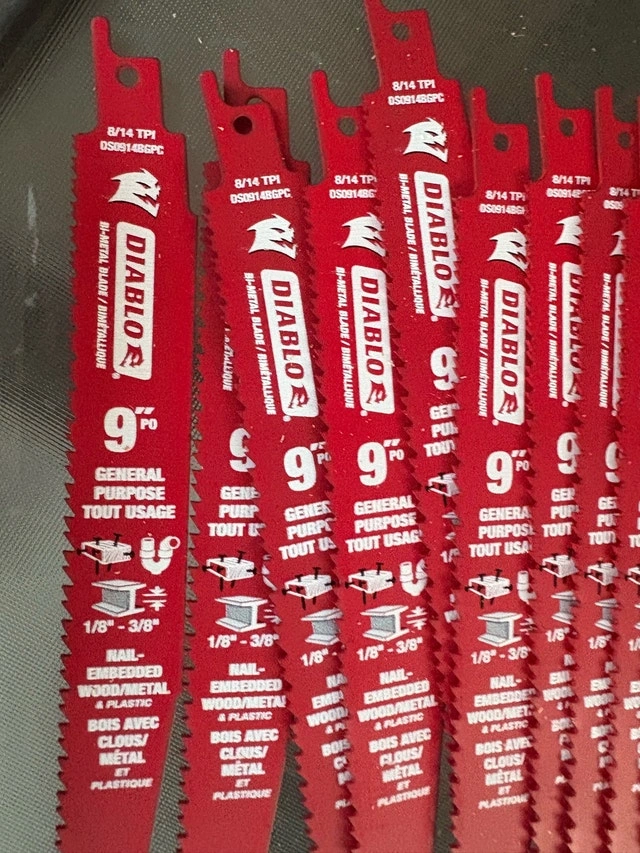 I'm offering a set of new Diablo 9-inch bi-metal reciprocating saw blades, perfect for general purpose cutting through nail-embedded wood, metal, and plastic. These blades feature an 8/14 TPI (teeth per inch) configuration for optimal cutting performance.