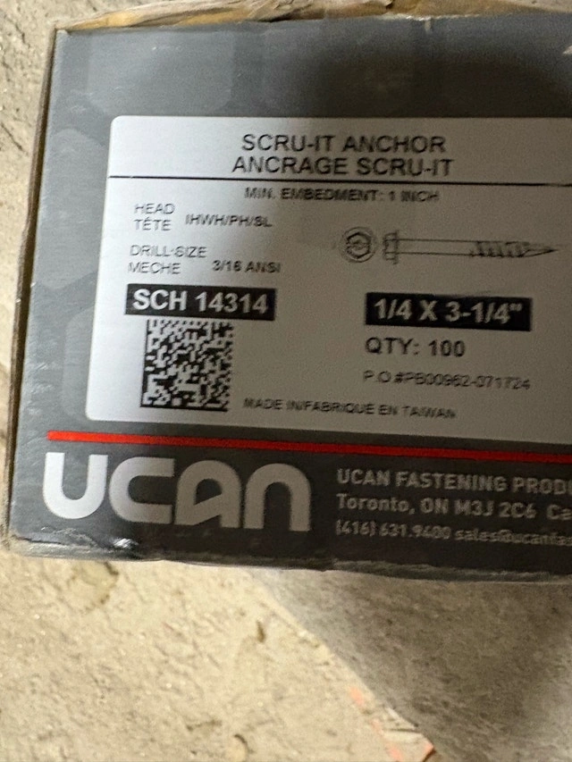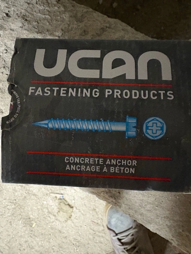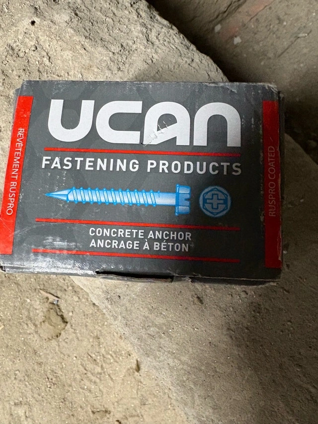 I'm offering a full, new box of UCan concrete screws, measuring 1/4 x 3-1/4 inches, perfect for all your anchoring needs. This box contains 100 screws. These screws are designed with a 3/16 ANSI drill size for easy installation. If the ad is up, the screws are available!