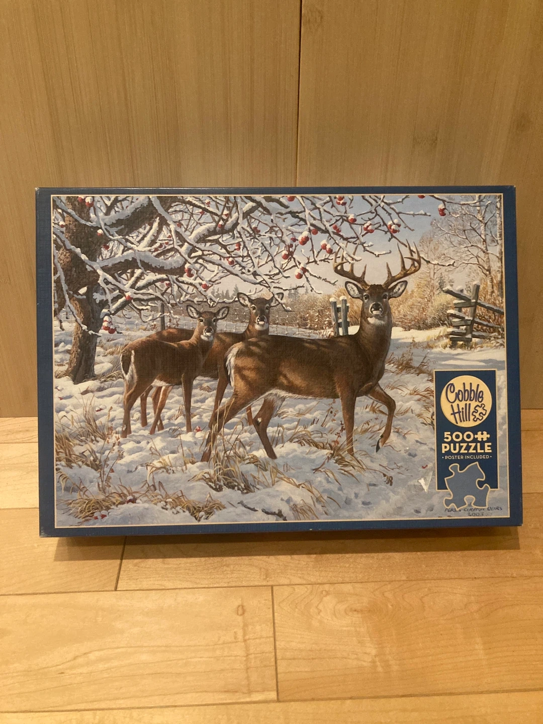 Selling a Cobble Hill 500+ piece puzzle featuring a lovely winter scene with deer. This puzzle has random-shaped pieces for a more interesting building experience. Perfect for cozy nights in!