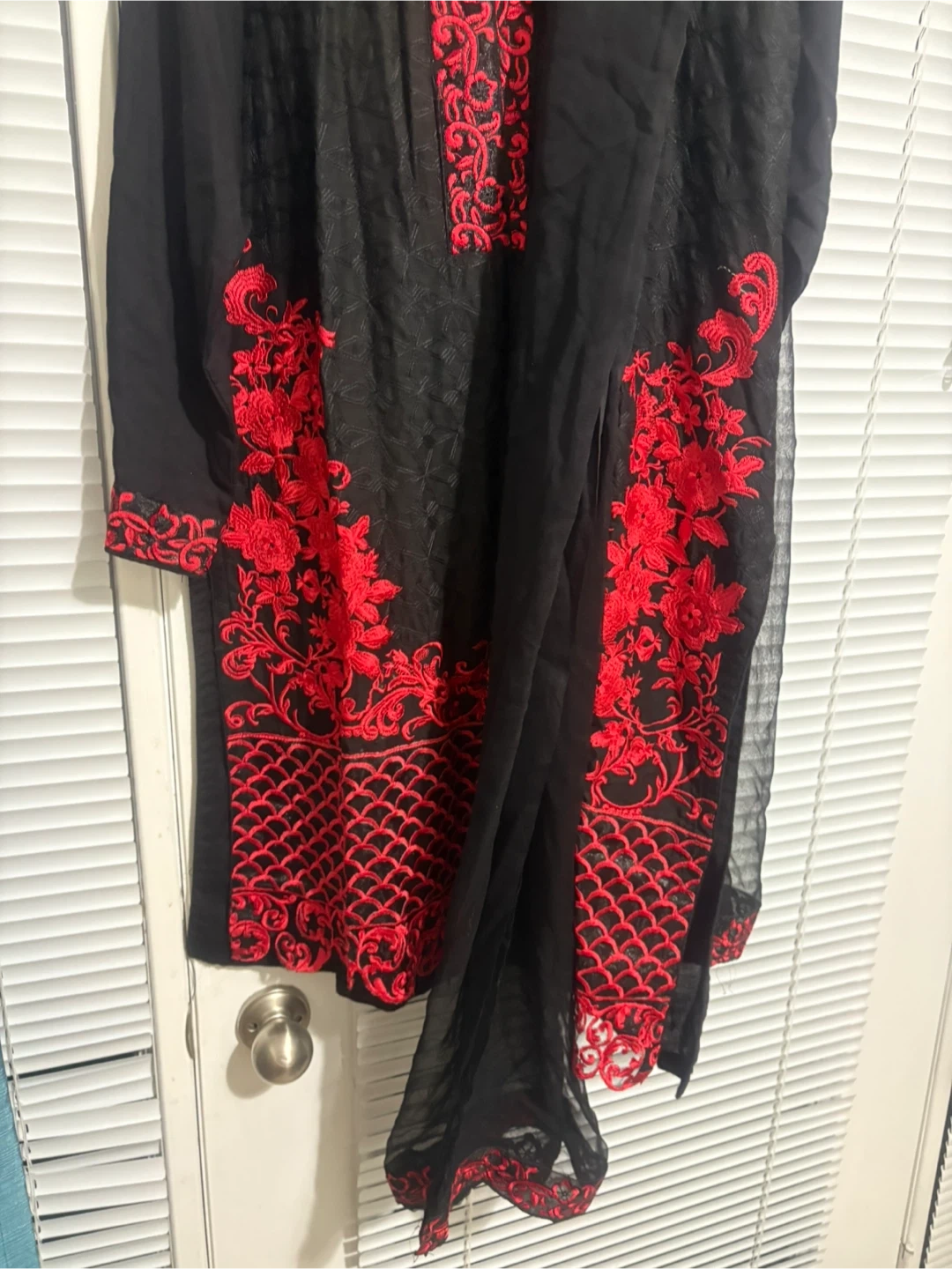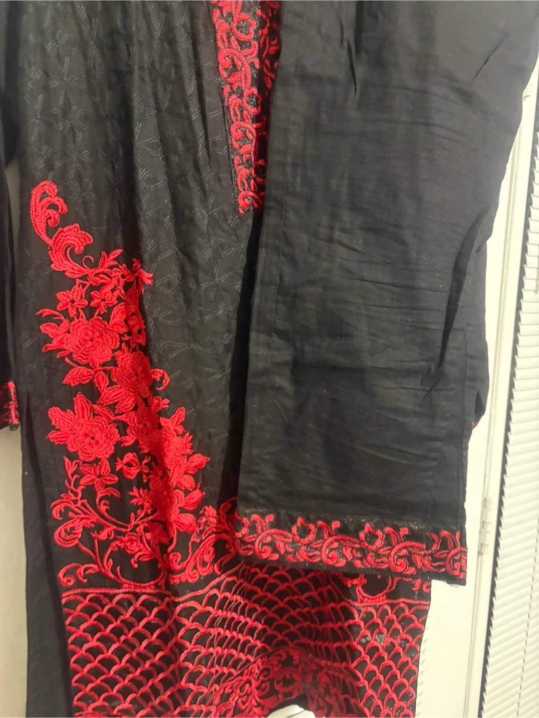 Beautiful black kurti with red embroidery, perfect for a special occasion or everyday wear! The material feels lightweight and comfortable. ( 3 piece suit ) size l