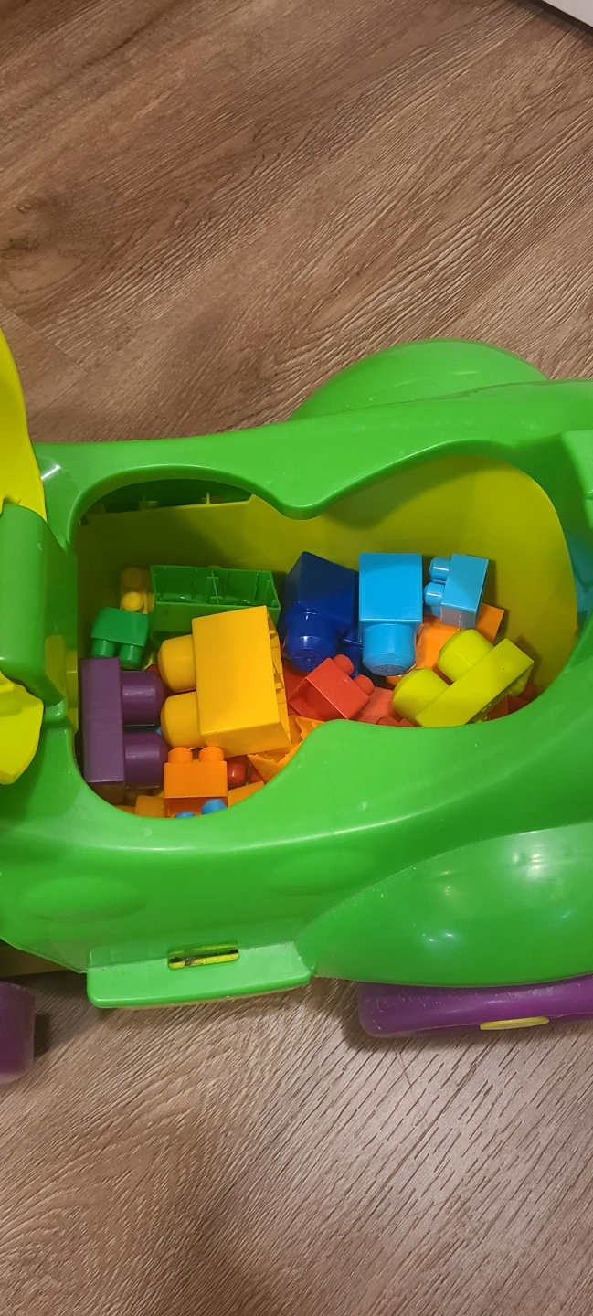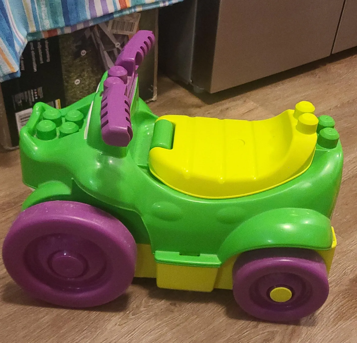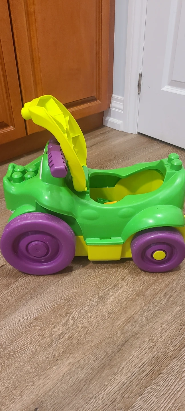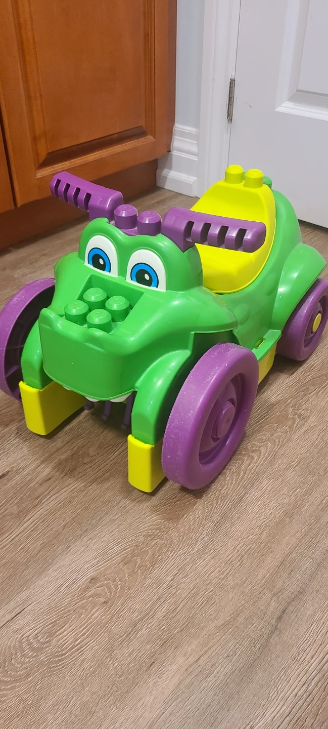 This is a fun Mega Bloks Crocodile Ride-On toy! It's in great shape and comes with a bunch of blocks that can be stored inside the crocodile. Perfect for toddlers who love to ride and build!