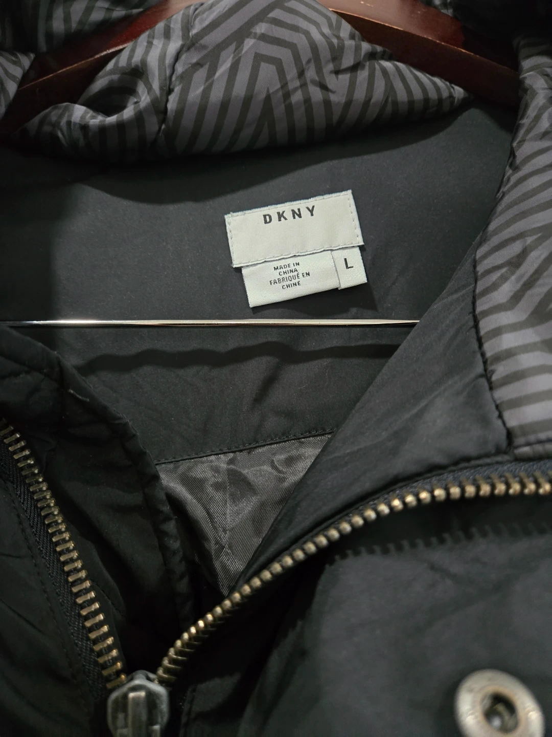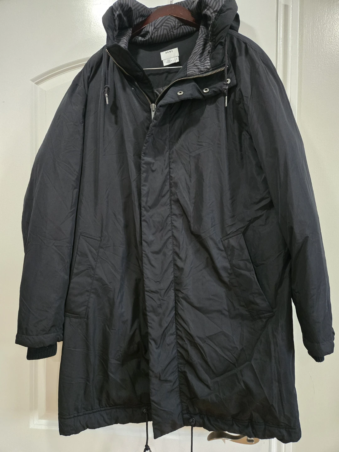 Selling a DKNY black puffer coat in size L. It's in good condition and perfect for the colder weather. The material is durable and the design is stylish!