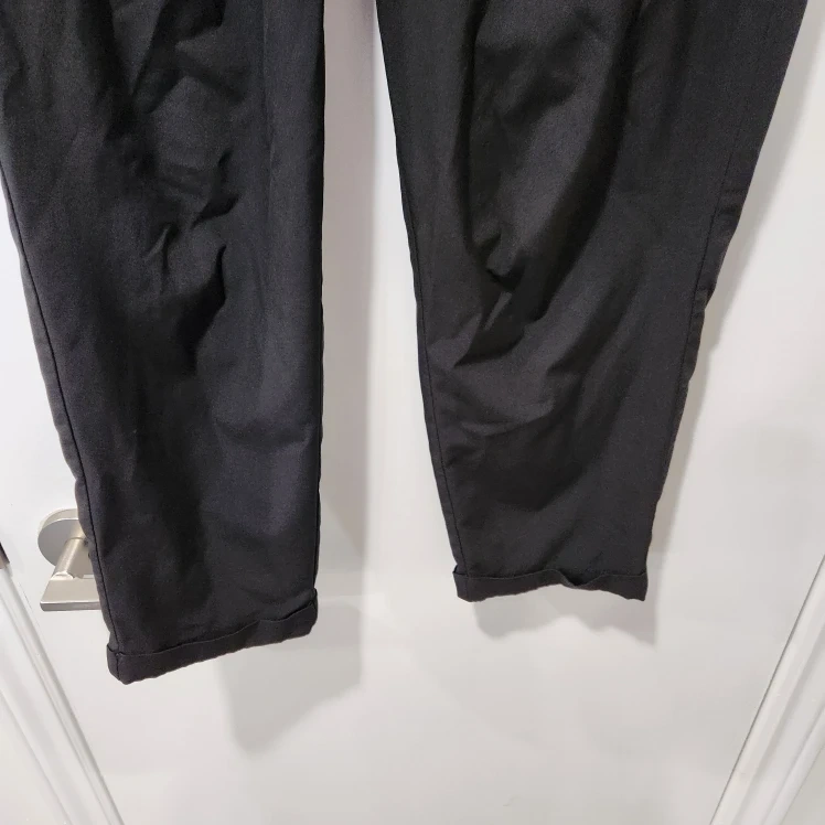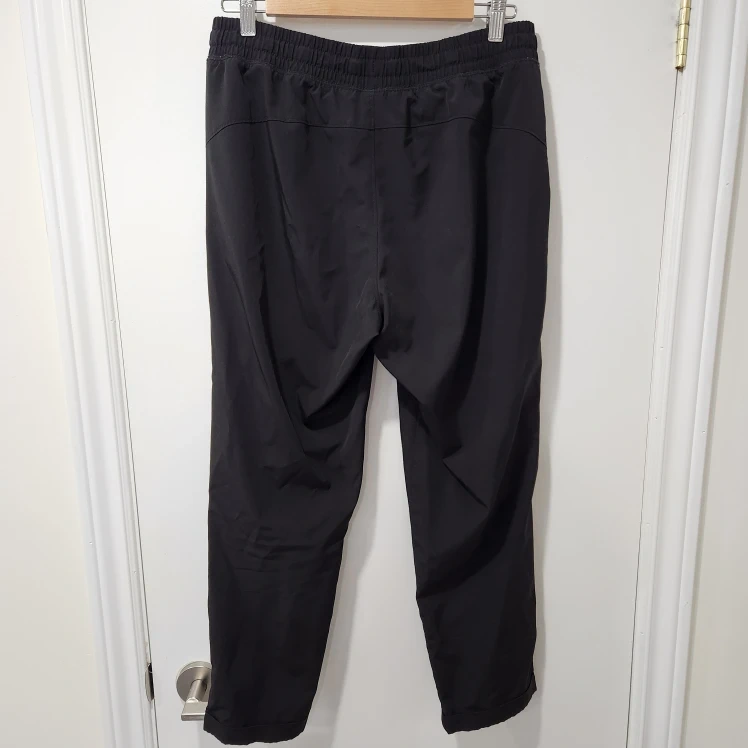 Comfortable black track pants. Elastic waistband with drawstring. Side pockets. Perfect for workouts or casual wear. Cuffed hem hits just above the ankle. Swishy material