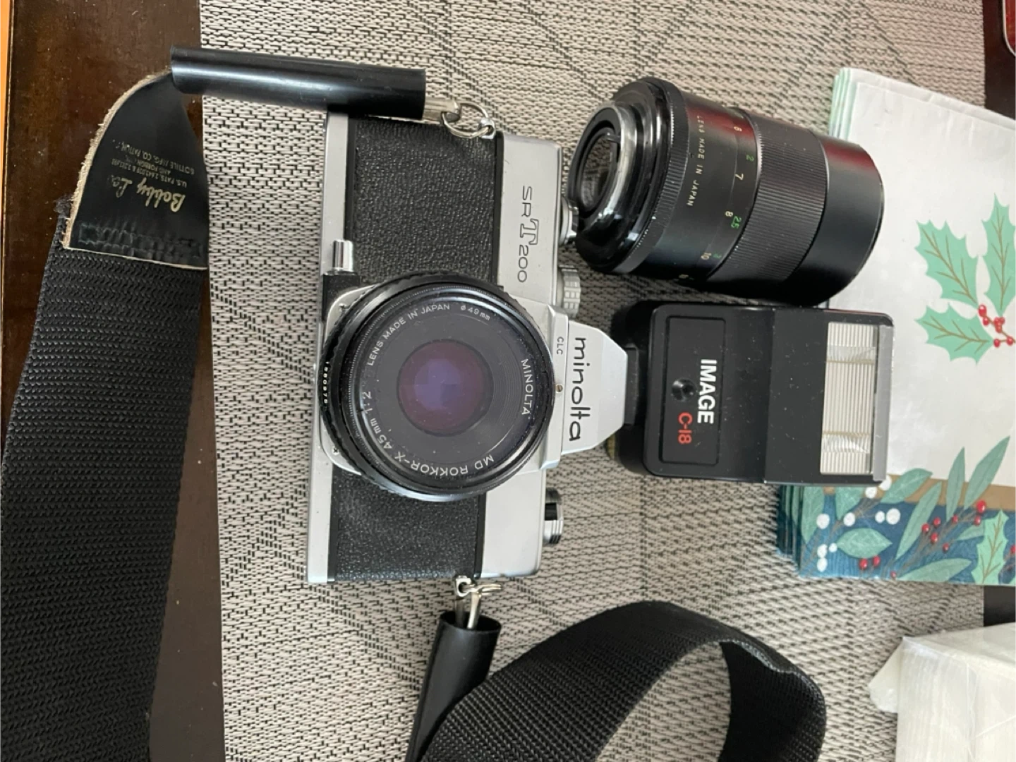 Selling a Minolta SRT 200 film camera. It comes with a lens made in Japan, a Minolta CLC lens, and an IMAGE C-18 flash attachment. The lens is a MD Rokkor-X 45mm 1:2.