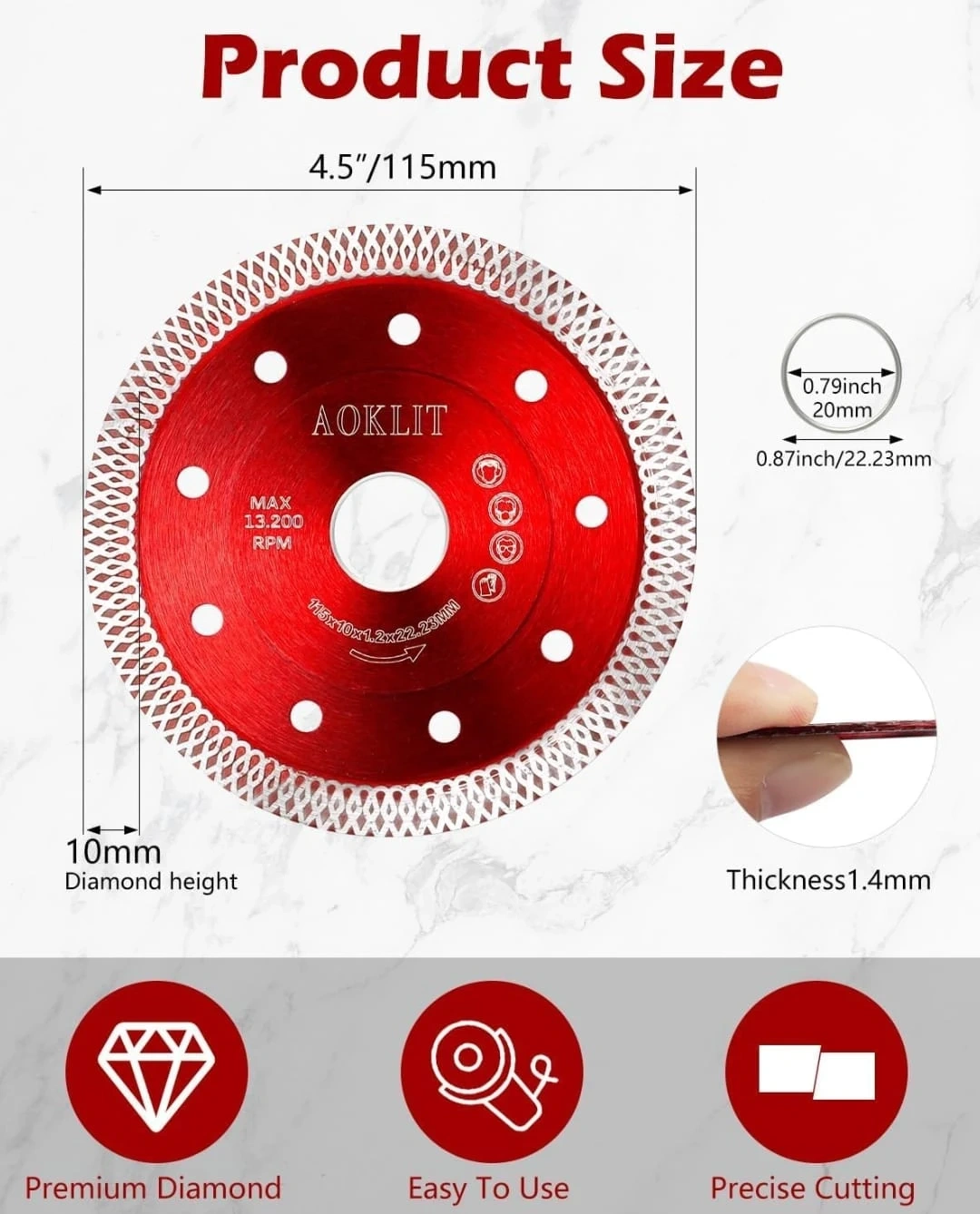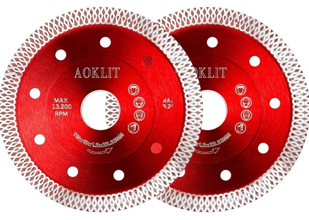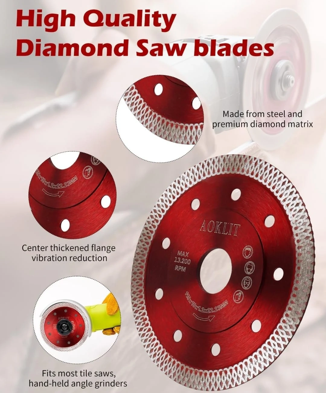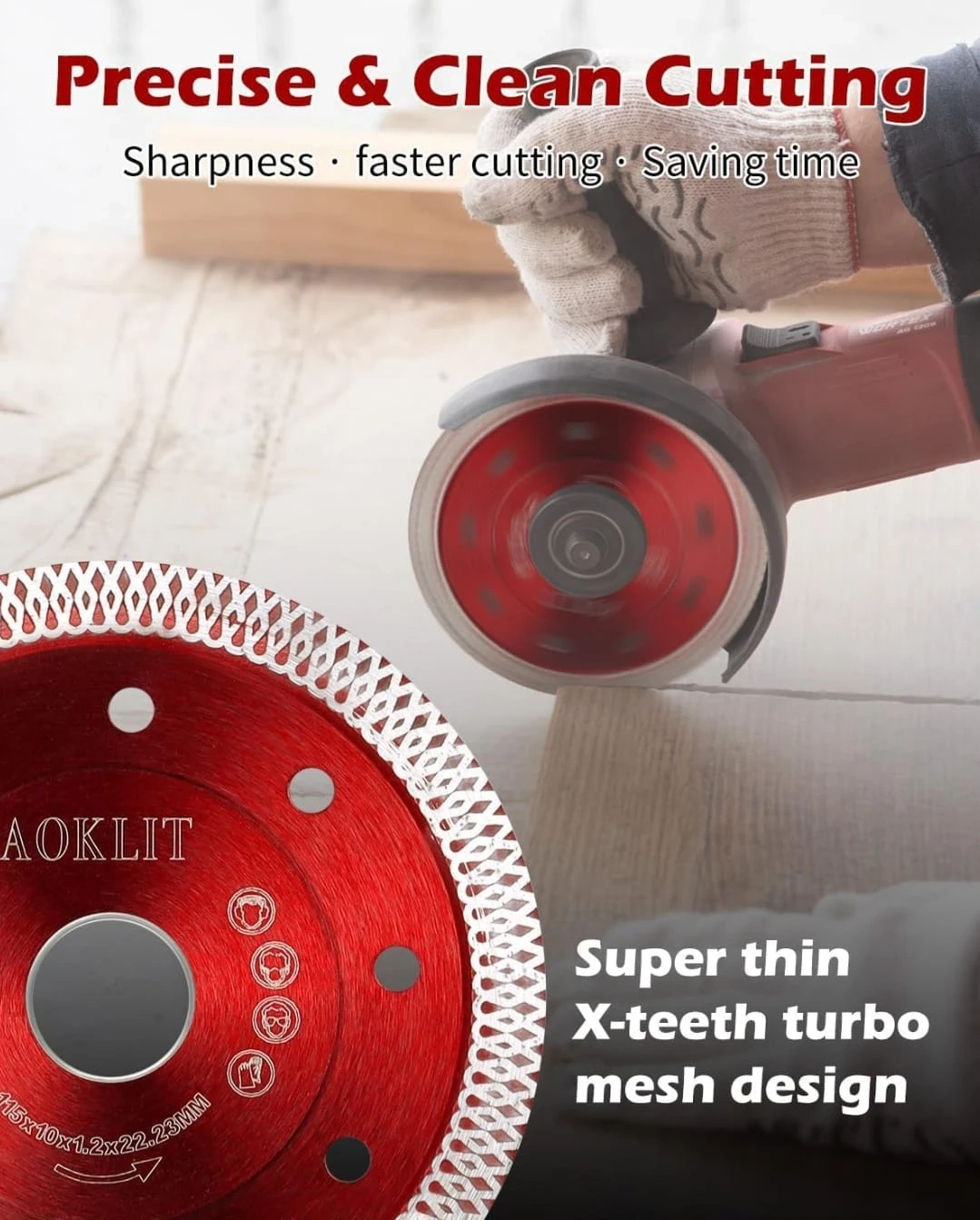 These AOKLIT diamond saw blades are great for cutting tile, porcelain, marble, brick, ceramic, and granite. They're made from steel and a premium diamond matrix. The super thin X-teeth turbo mesh design allows for precise and clean cutting. They fit most tile saws and hand-held angle grinders.