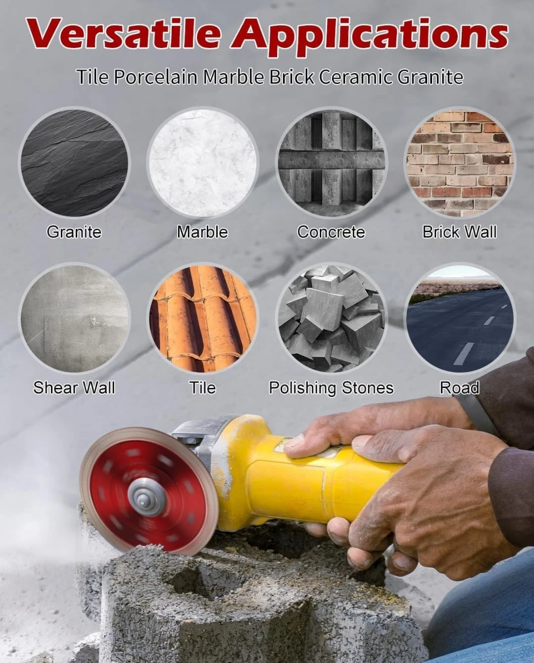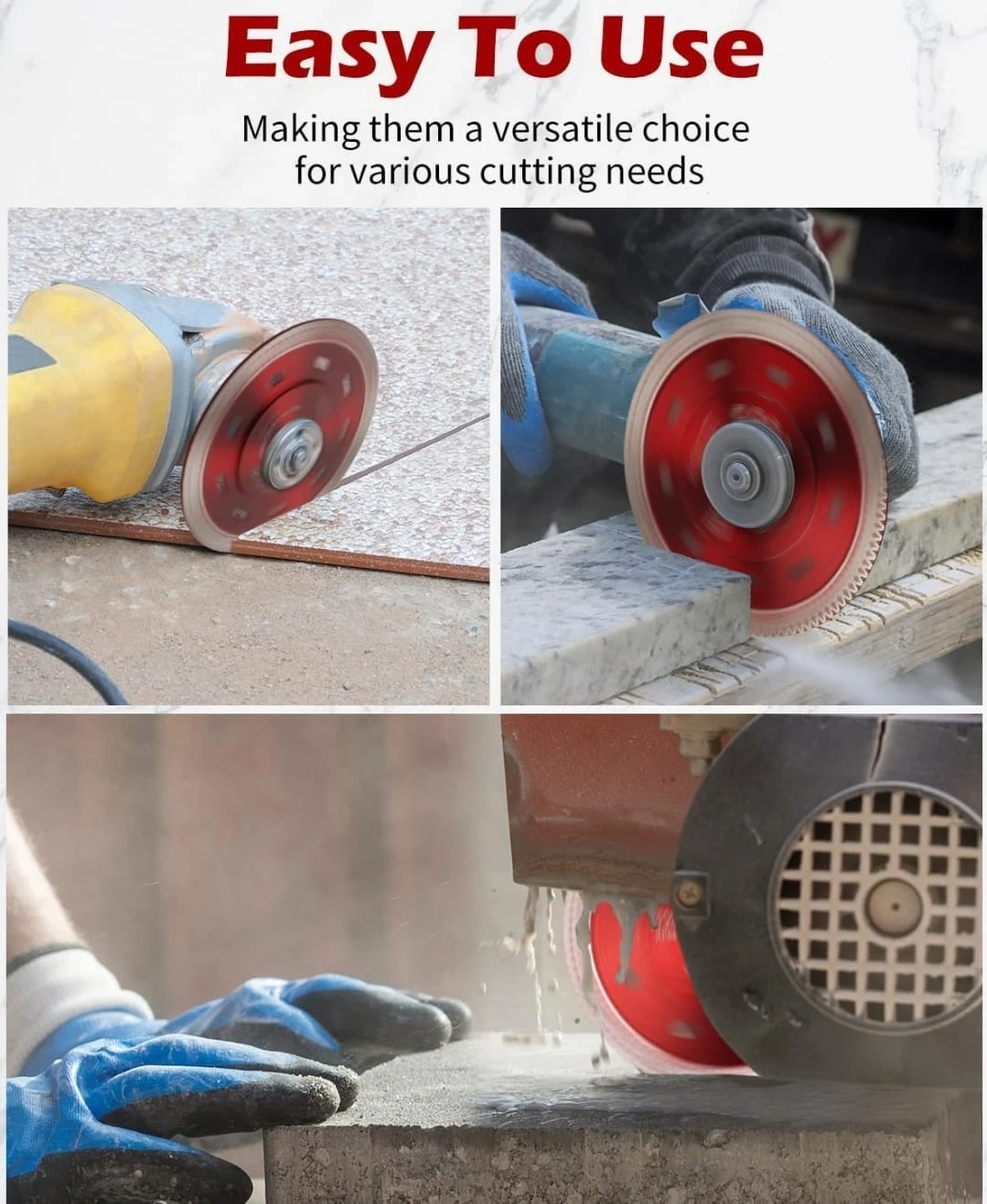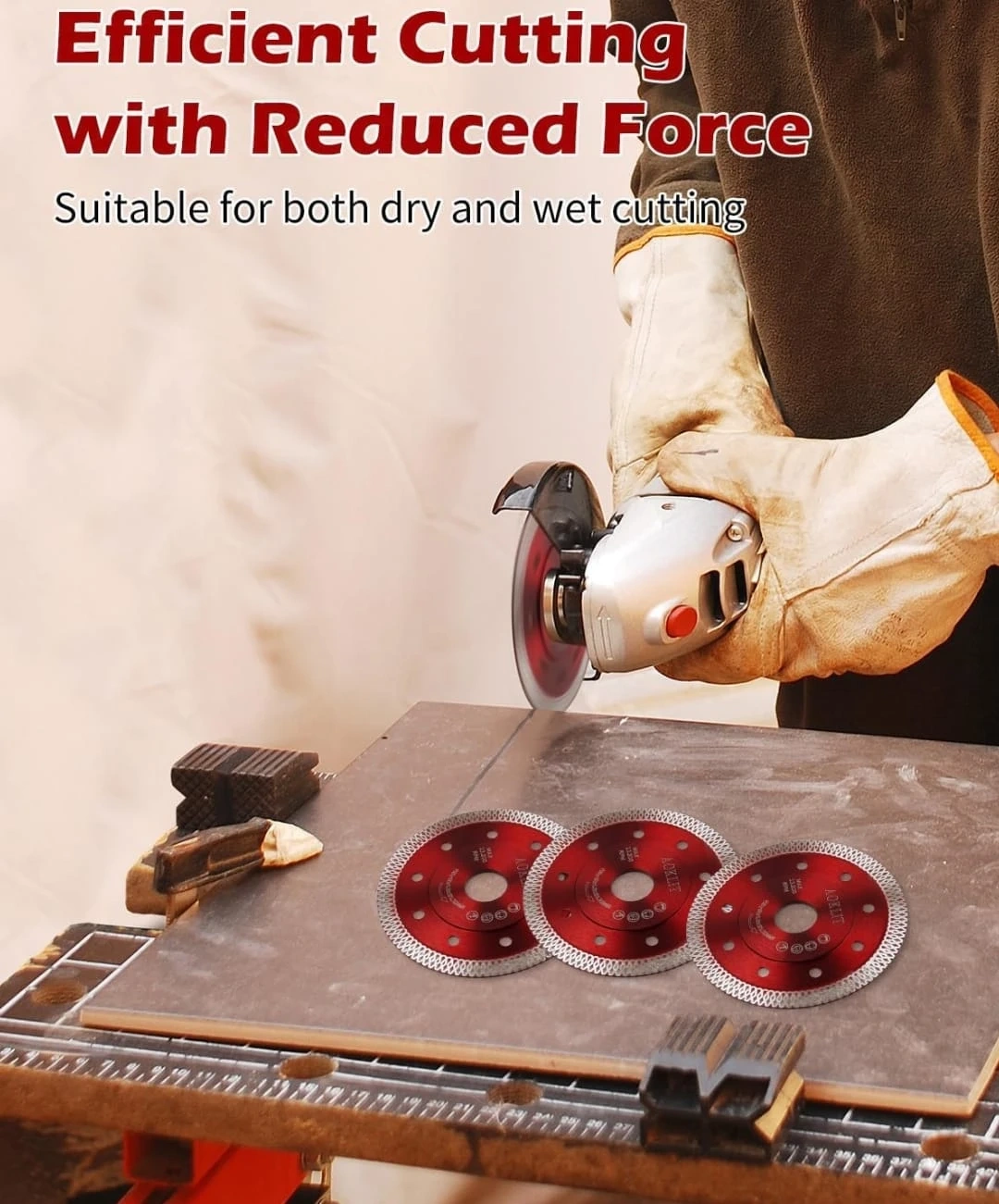 These AOKLIT diamond saw blades are great for cutting tile, porcelain, marble, brick, ceramic, and granite. They're made from steel and a premium diamond matrix. The super thin X-teeth turbo mesh design allows for precise and clean cutting. They fit most tile saws and hand-held angle grinders.