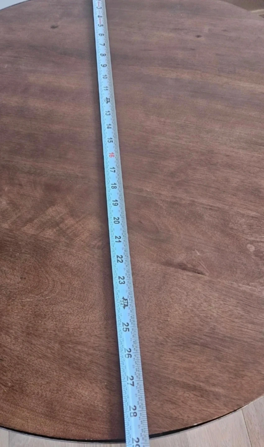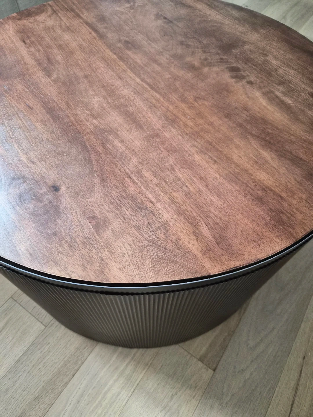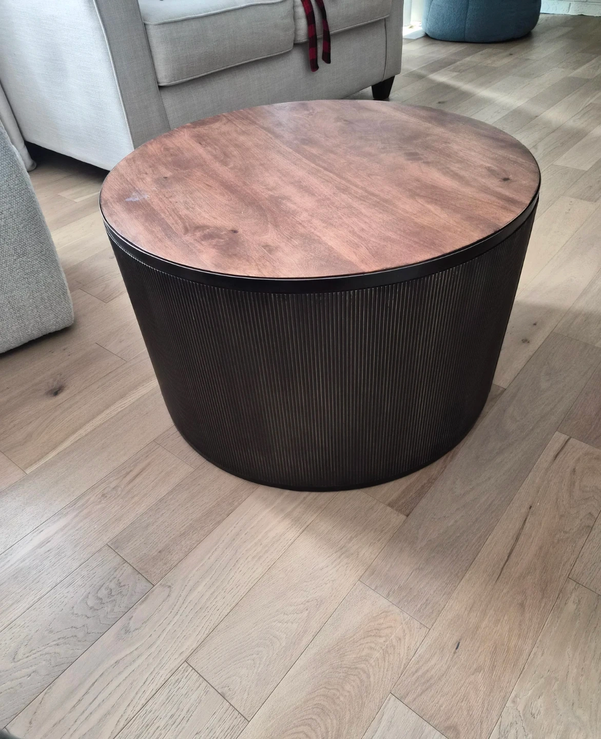 Here's a stylish round coffee table that would look great in any living room! It features a dark brown wood top and a base with a unique ribbed design. It measures approximately 18 inches tall and 29 inches in diameter.