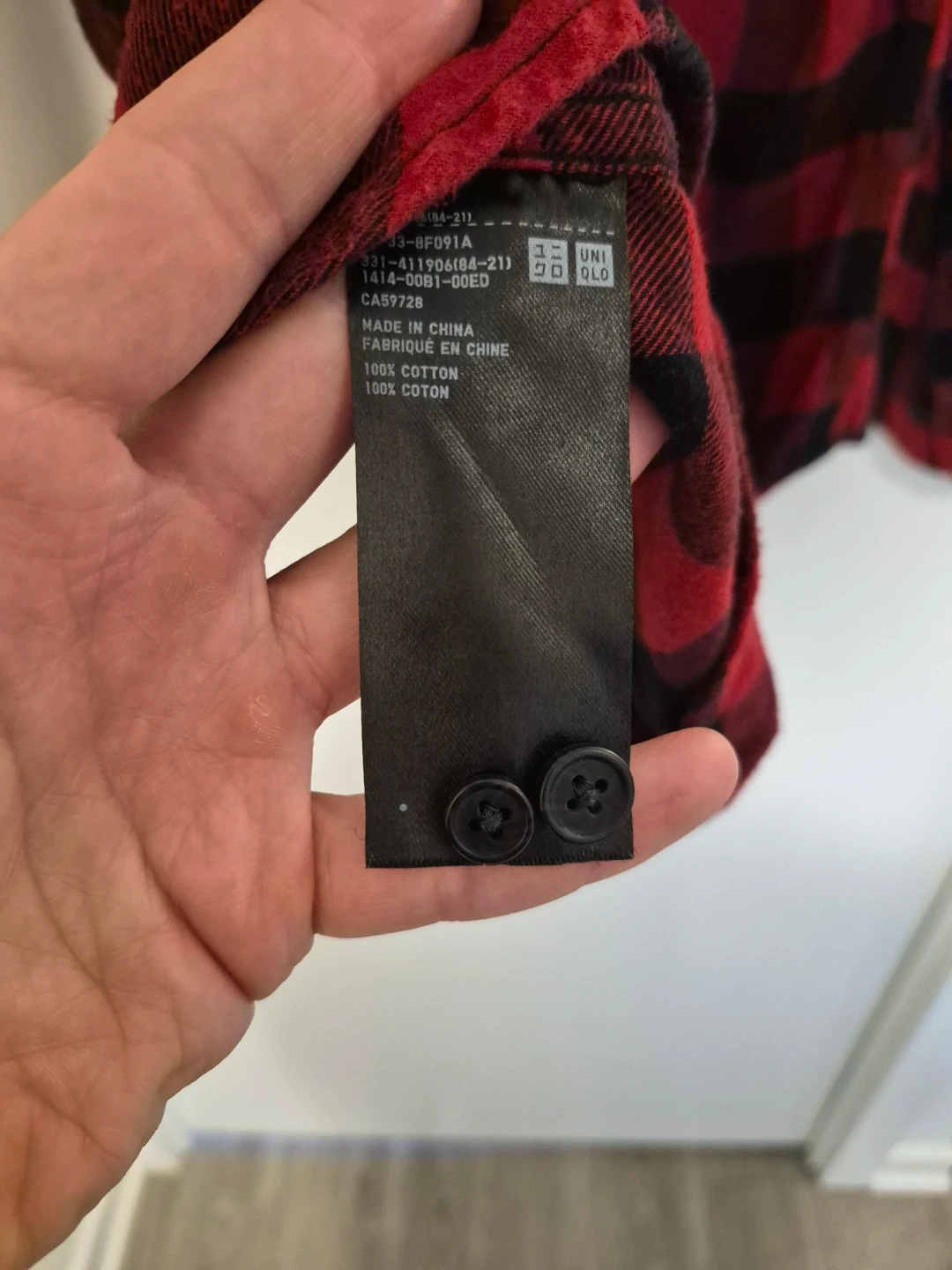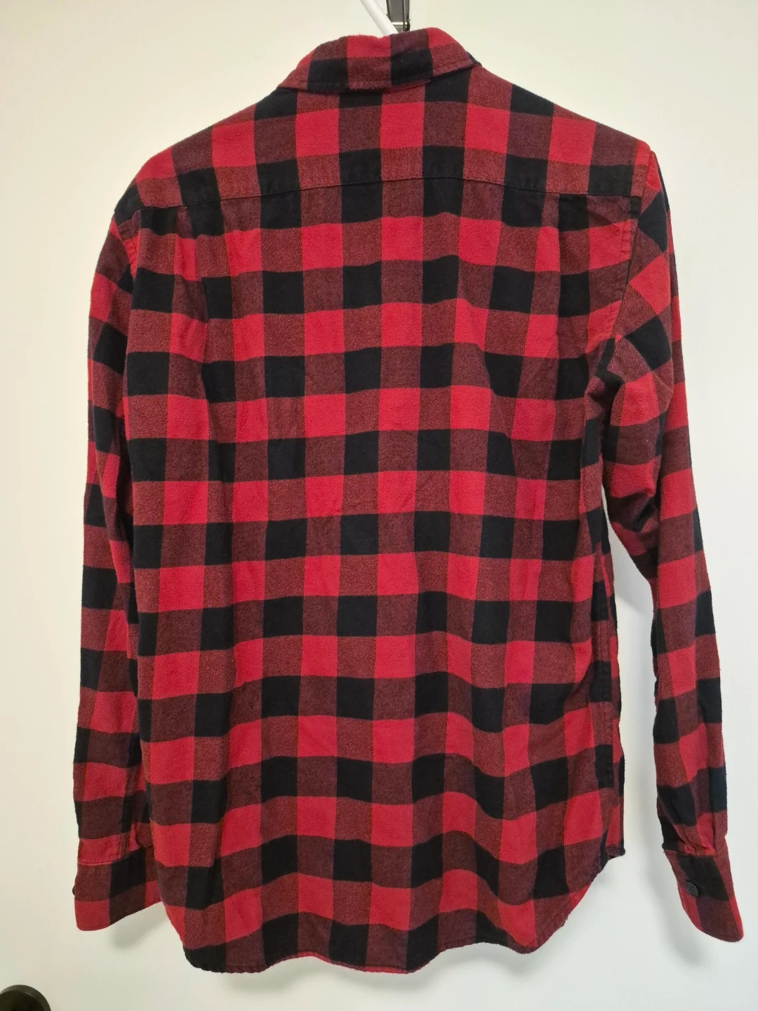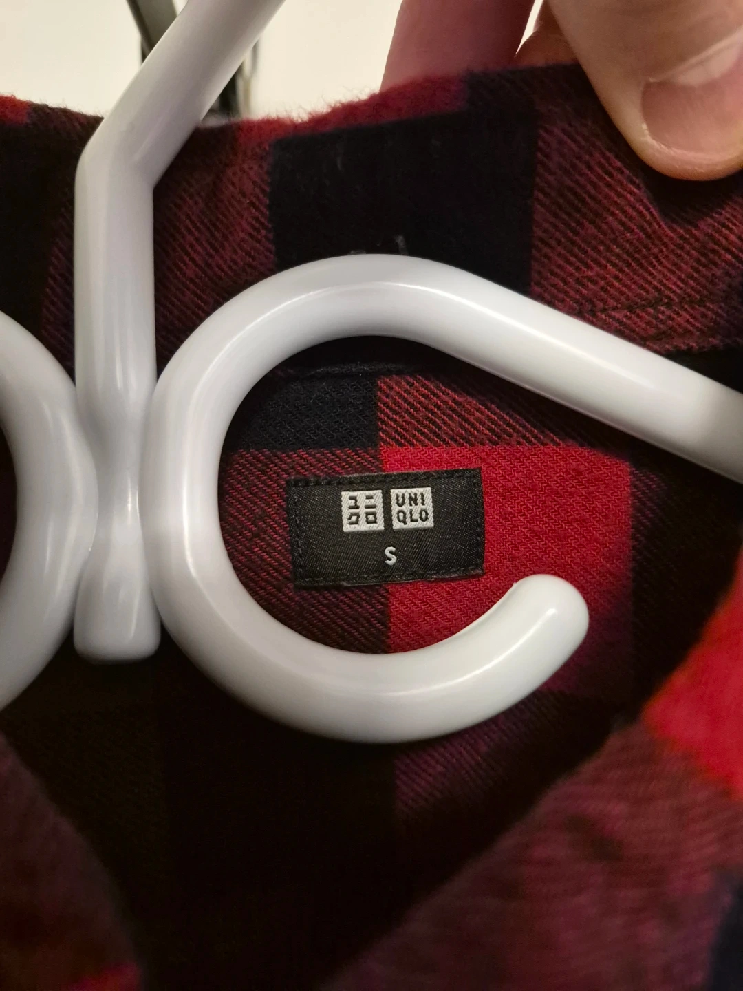 Classic Uniqlo flannel shirt in a red and black buffalo plaid pattern. It's a size small and made of 100% cotton. Great for layering or wearing on its own!