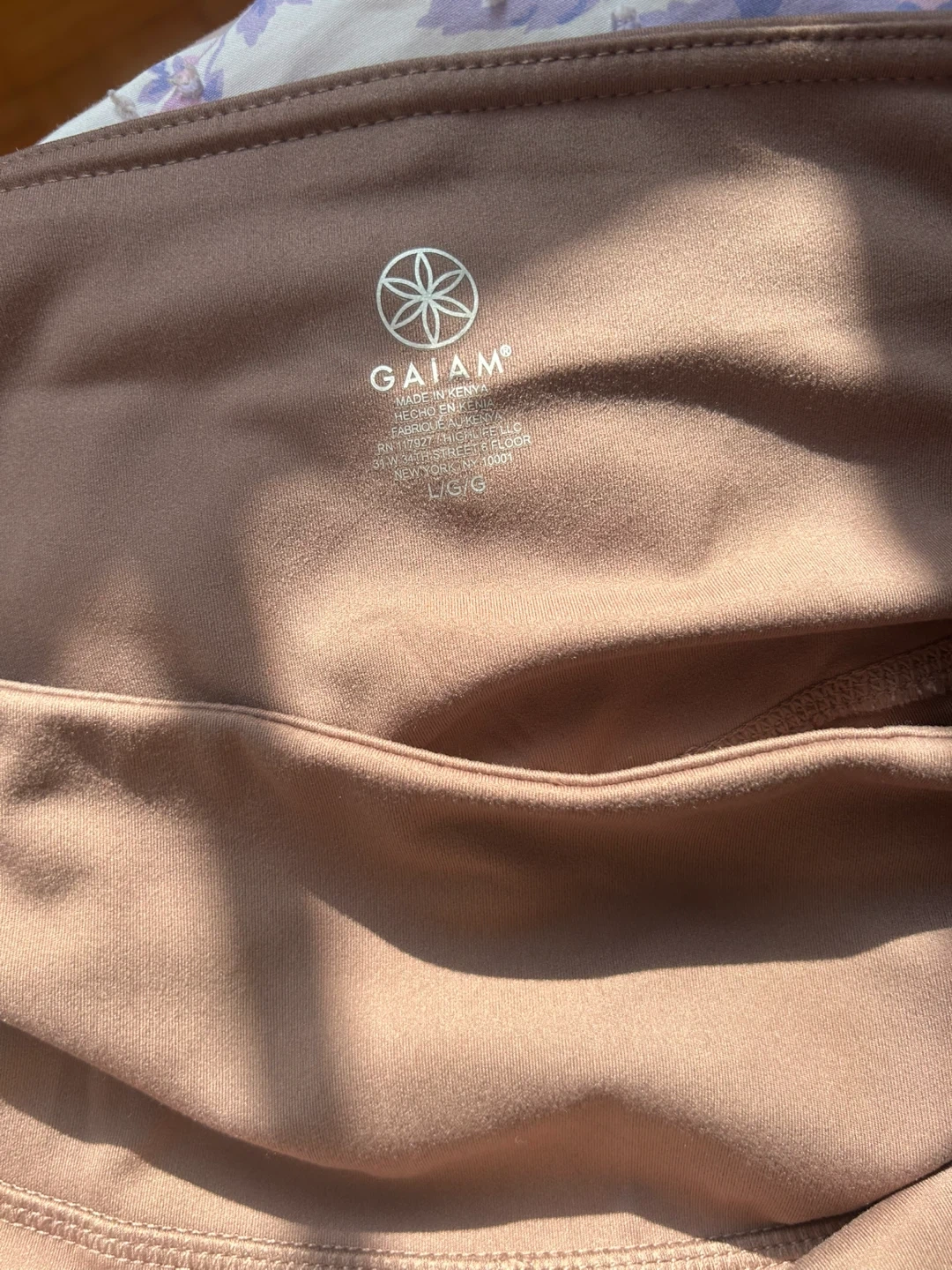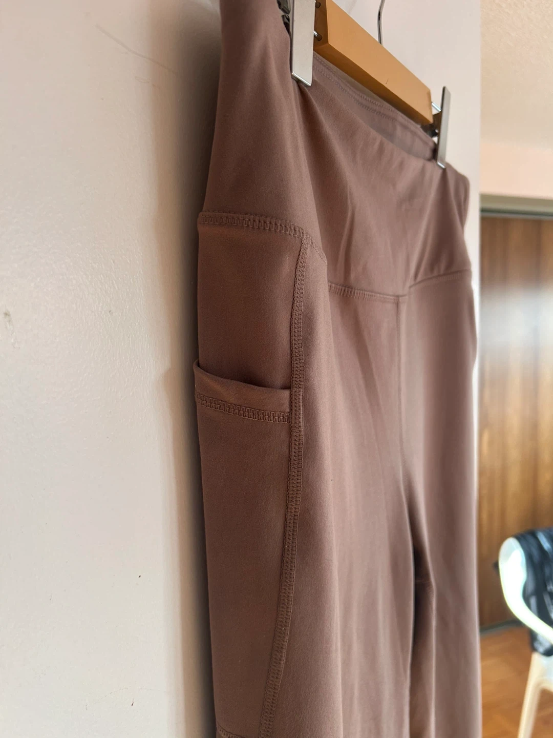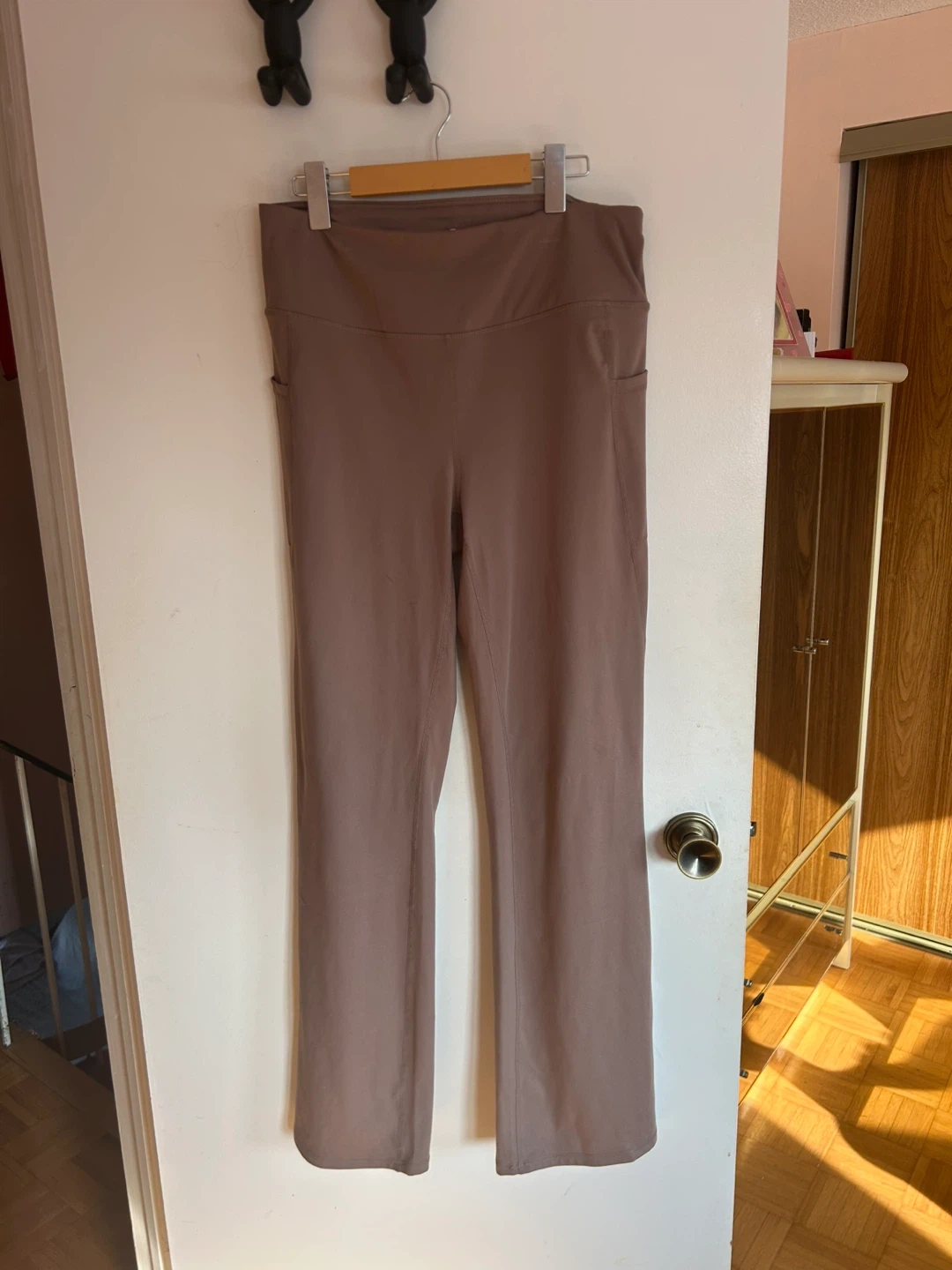 Selling a pair of Gaiam yoga pants in a lovely light brown colour! They are a size large and feature a handy pocket on each side and flared bottoms. Perfect for yoga, workouts, or just lounging around the house.