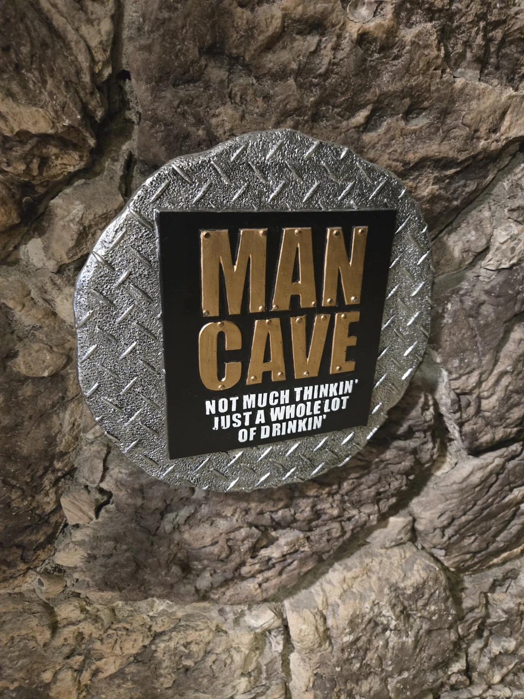 This is a fun Man Cave sign! It's got a cool industrial look with a diamond plate design and a black square with gold lettering. It says 'Man Cave' and then 'Not much thinkin' just a whole lot of drinkin''.