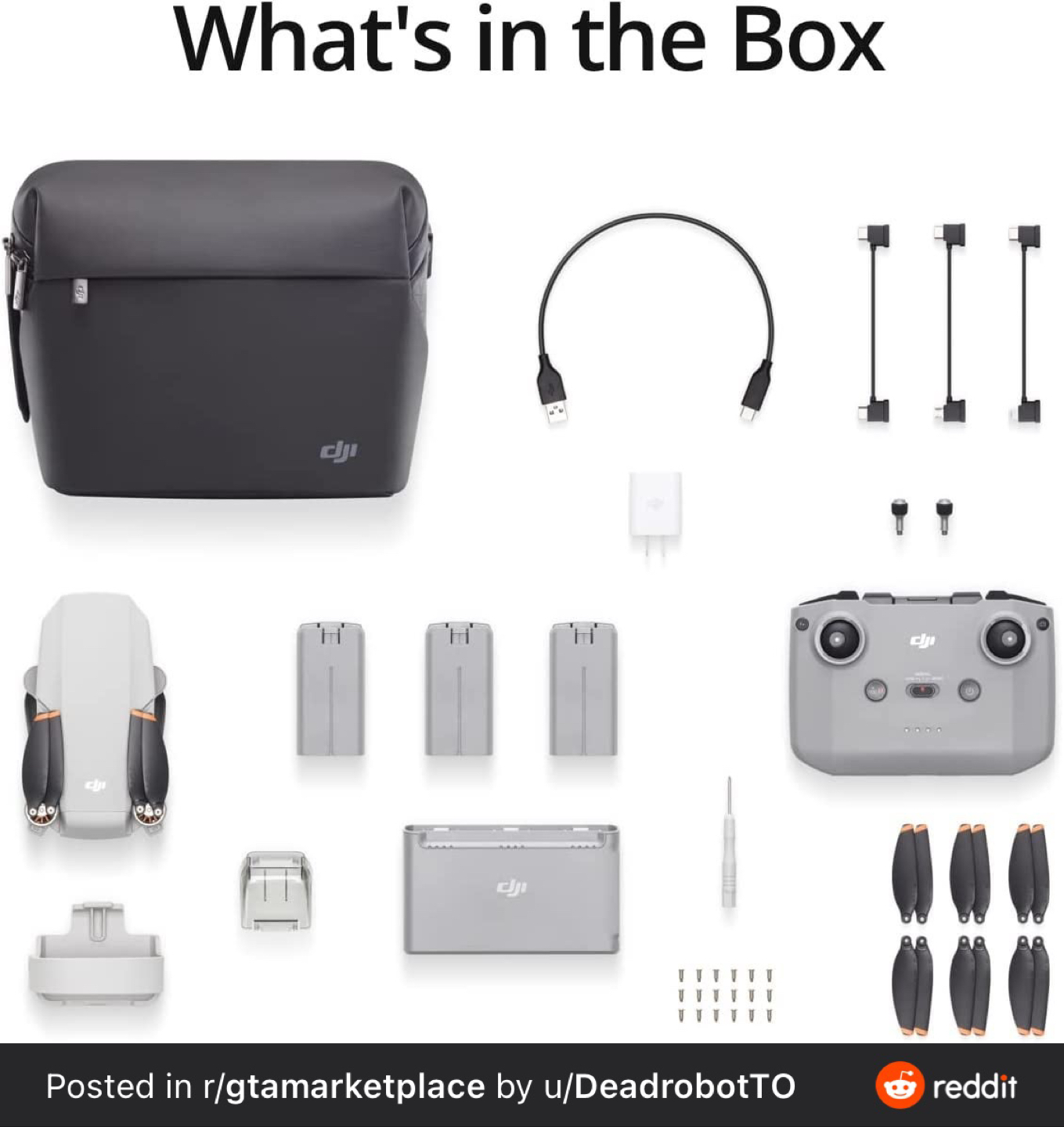 Mini 2 Aircraft, Remote Controller, 3 Intelligent Flight Batteries, 3 Spare Propellers, Type-C Cable, Gimbal Protector, RC Cable (Micro USB connector), RC Cable (USB-C connector), RC Cable (Lightning connector), Spare Control Sticks (Pair), Propeller Holder, Two-Way Charging Hub, DJI 18W USB Charger, Shoulder Bag