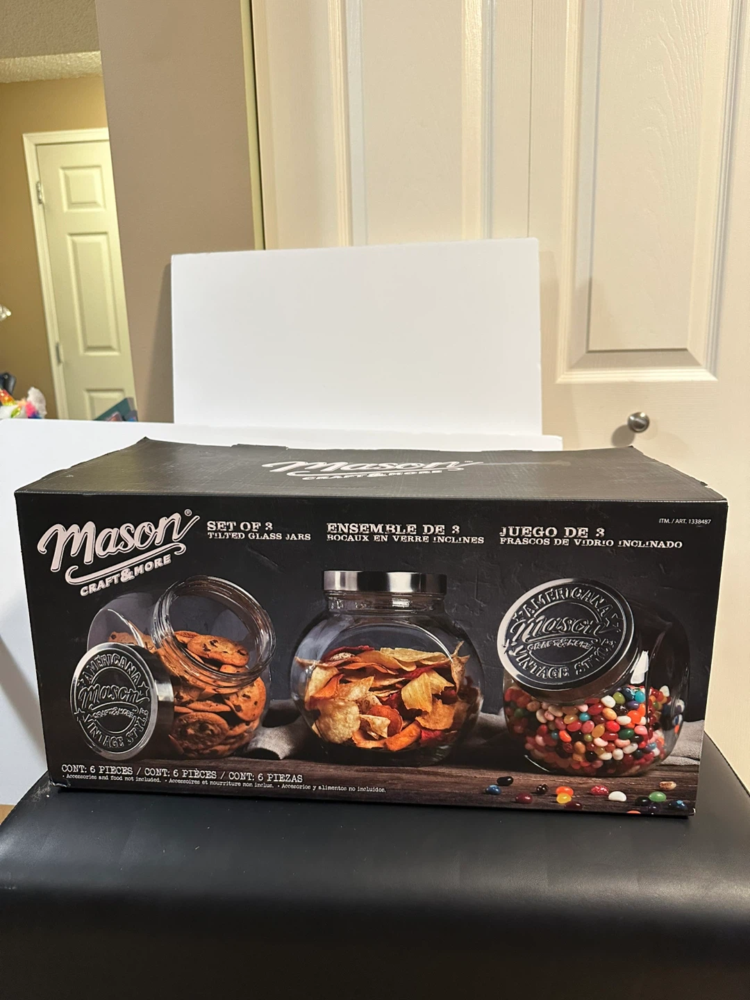 Selling a brand new set of Mason Craft & More tilted glass jars! This set includes 3 jars, perfect for adding a vintage touch to your kitchen or pantry. Each set contains 6 pieces total. Accessories and food are not included