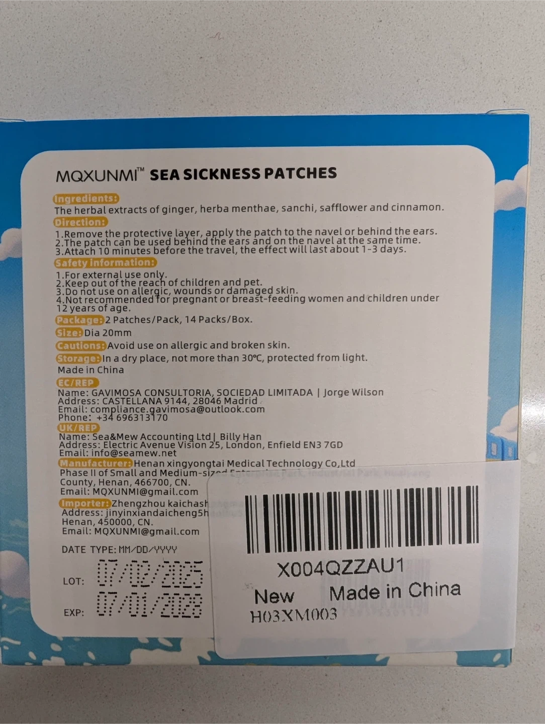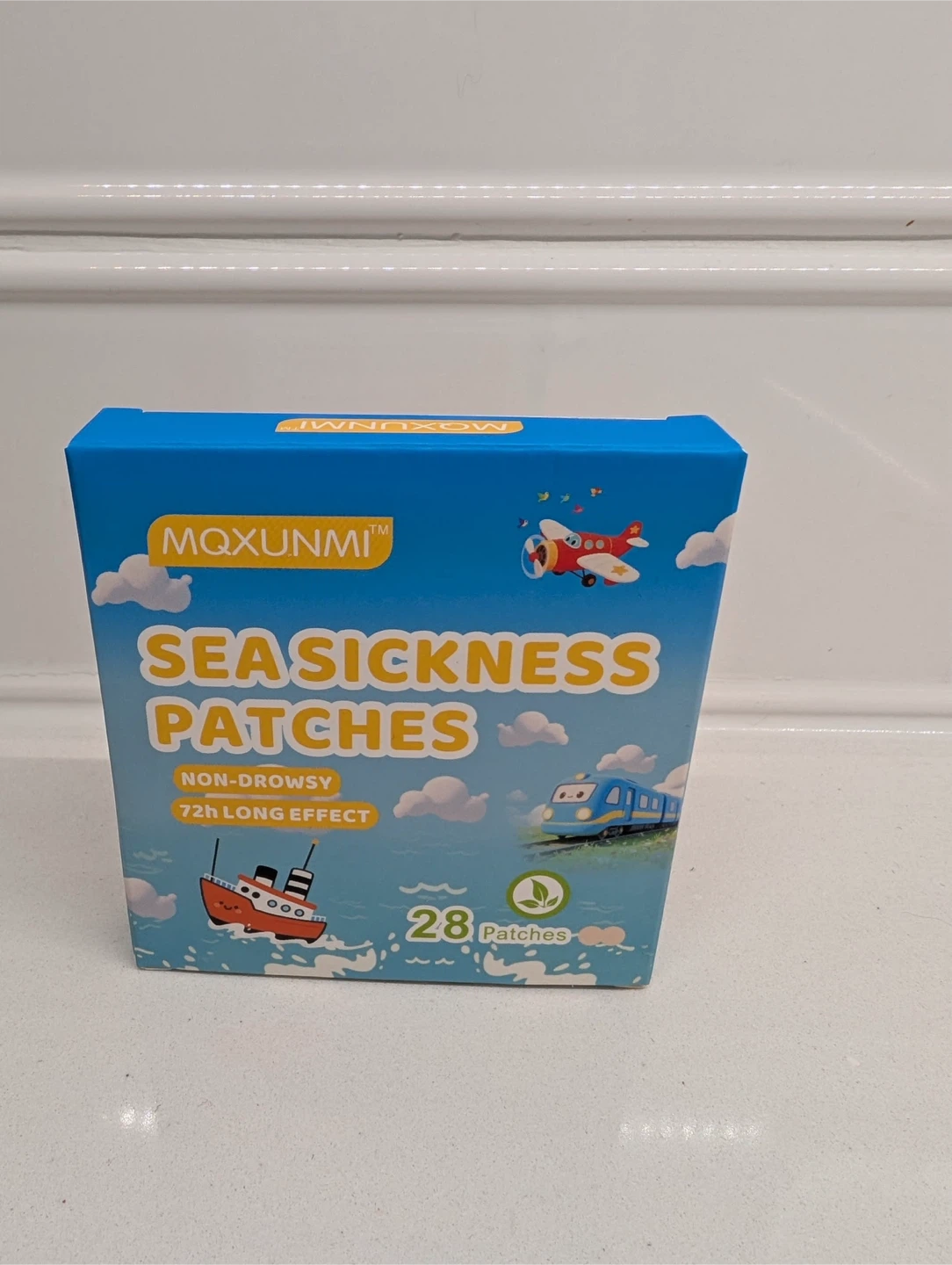 MQXUNMI Sea Sickness Patches for motion sickness relief. Each patch provides a 72-hour long effect and is non-drowsy. The box contains 28 patches. Expiry date is January 01, 2028. Ingredients include ginger, herba menthae, sanchi, safflower and cinnamon