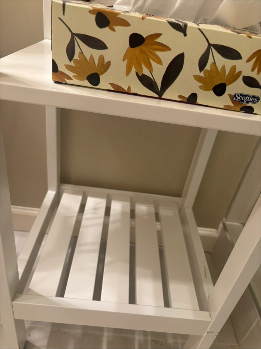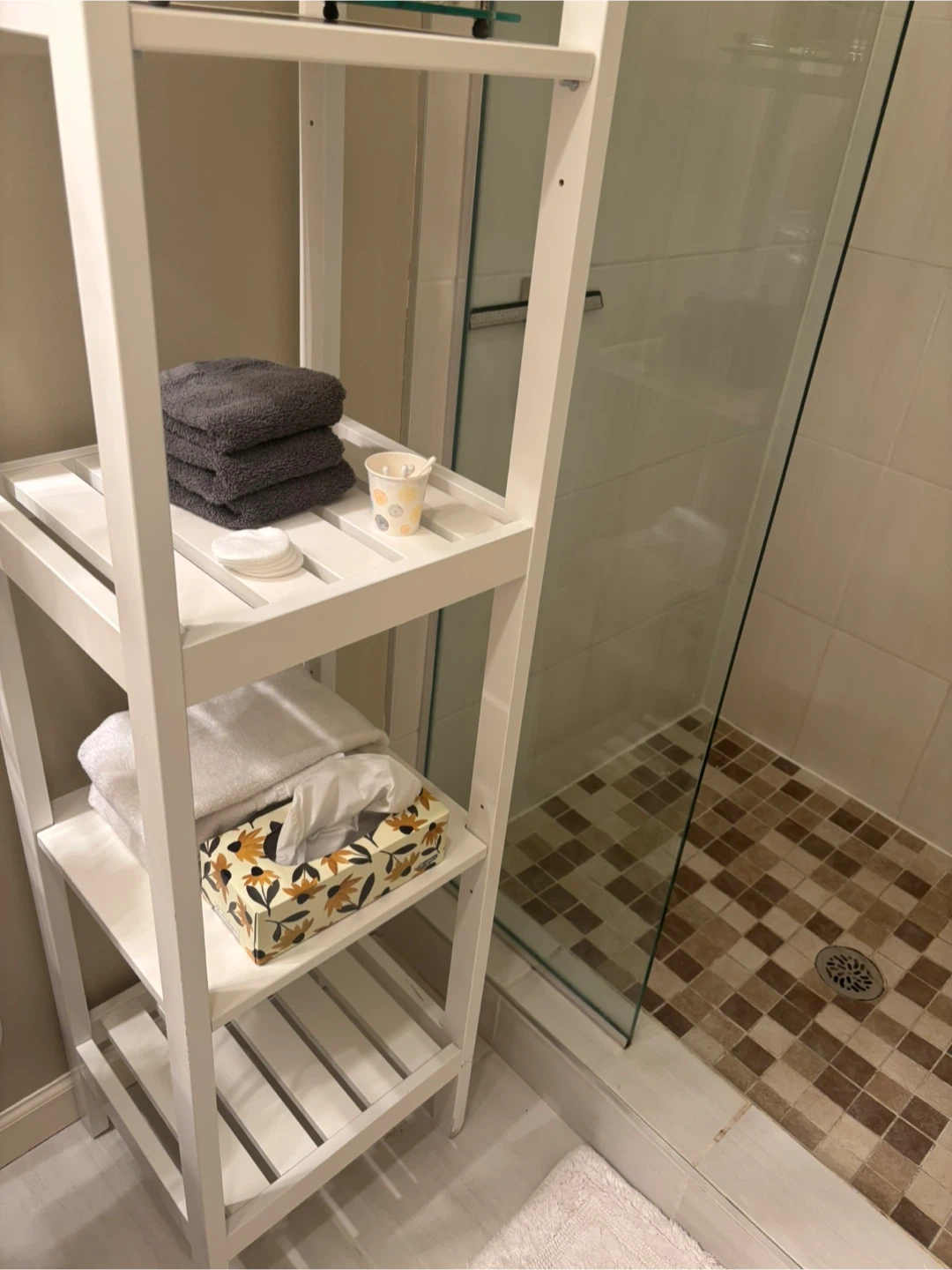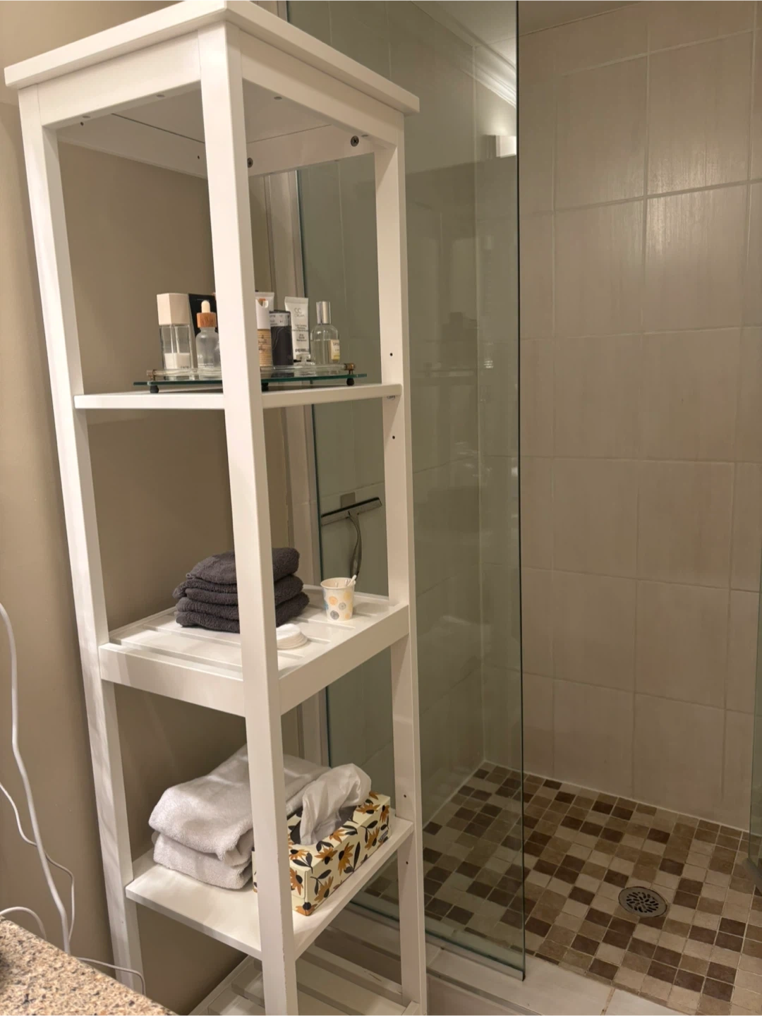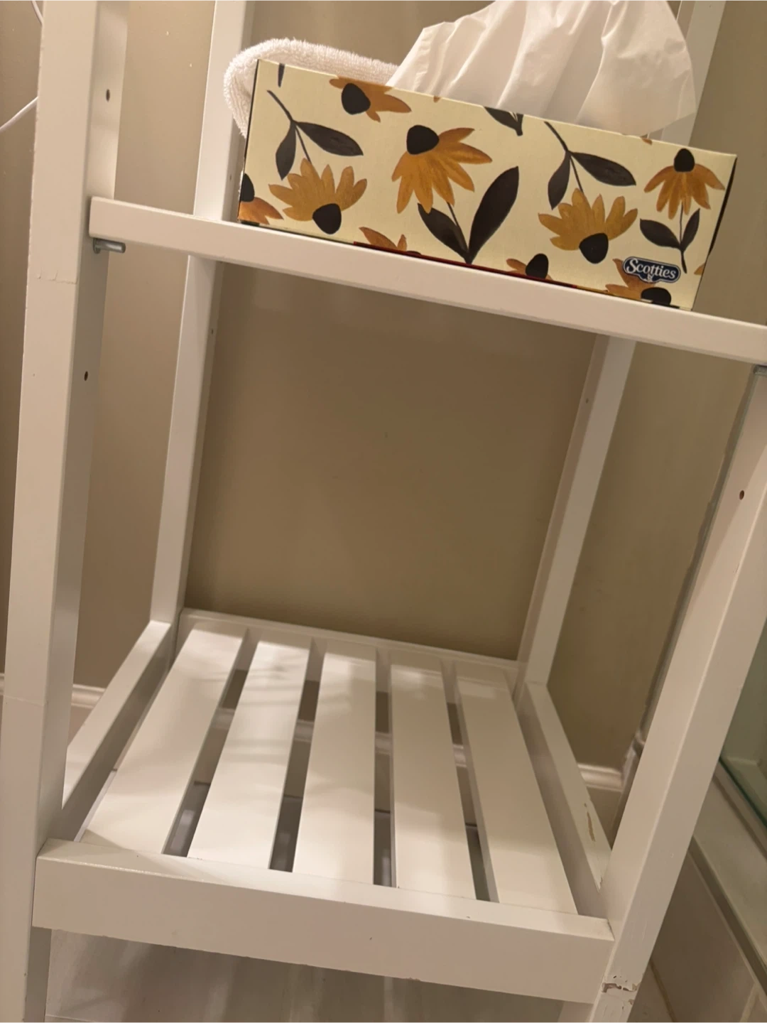 Selling a white bathroom shelf. It's in great condition and perfect for organizing your bathroom essentials. It has four shelves. Great for towels, toiletries, and more!