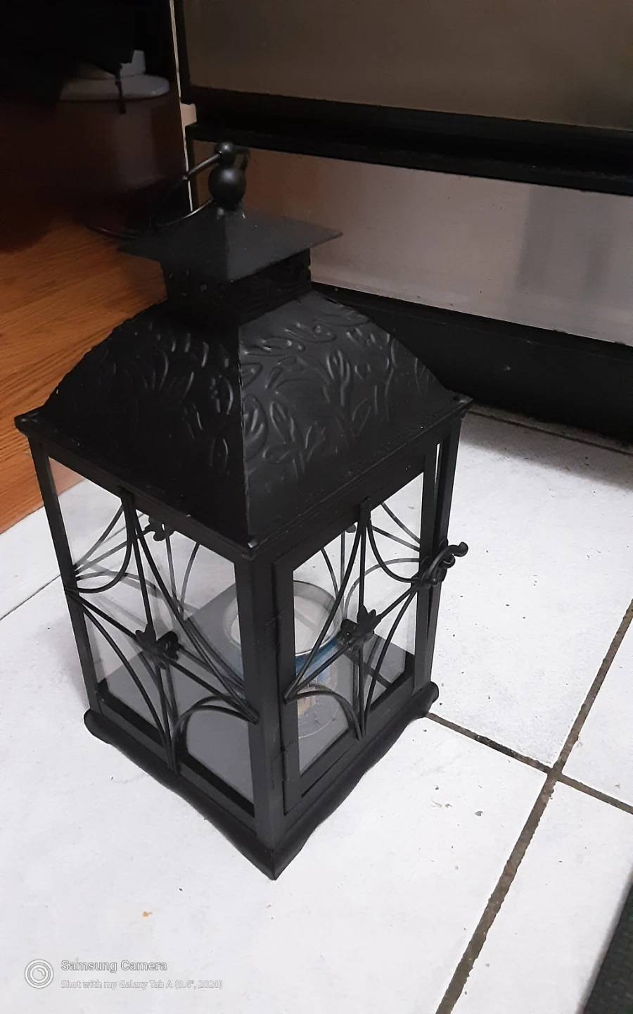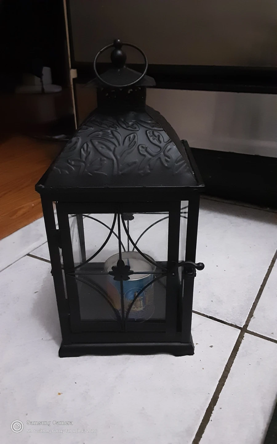 This is a lovely black metal candle lantern that would look great in any room. It's in good condition and ready to add a touch of warmth to your space