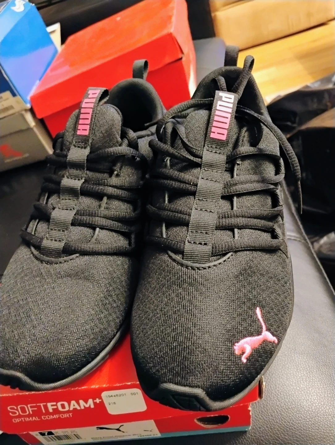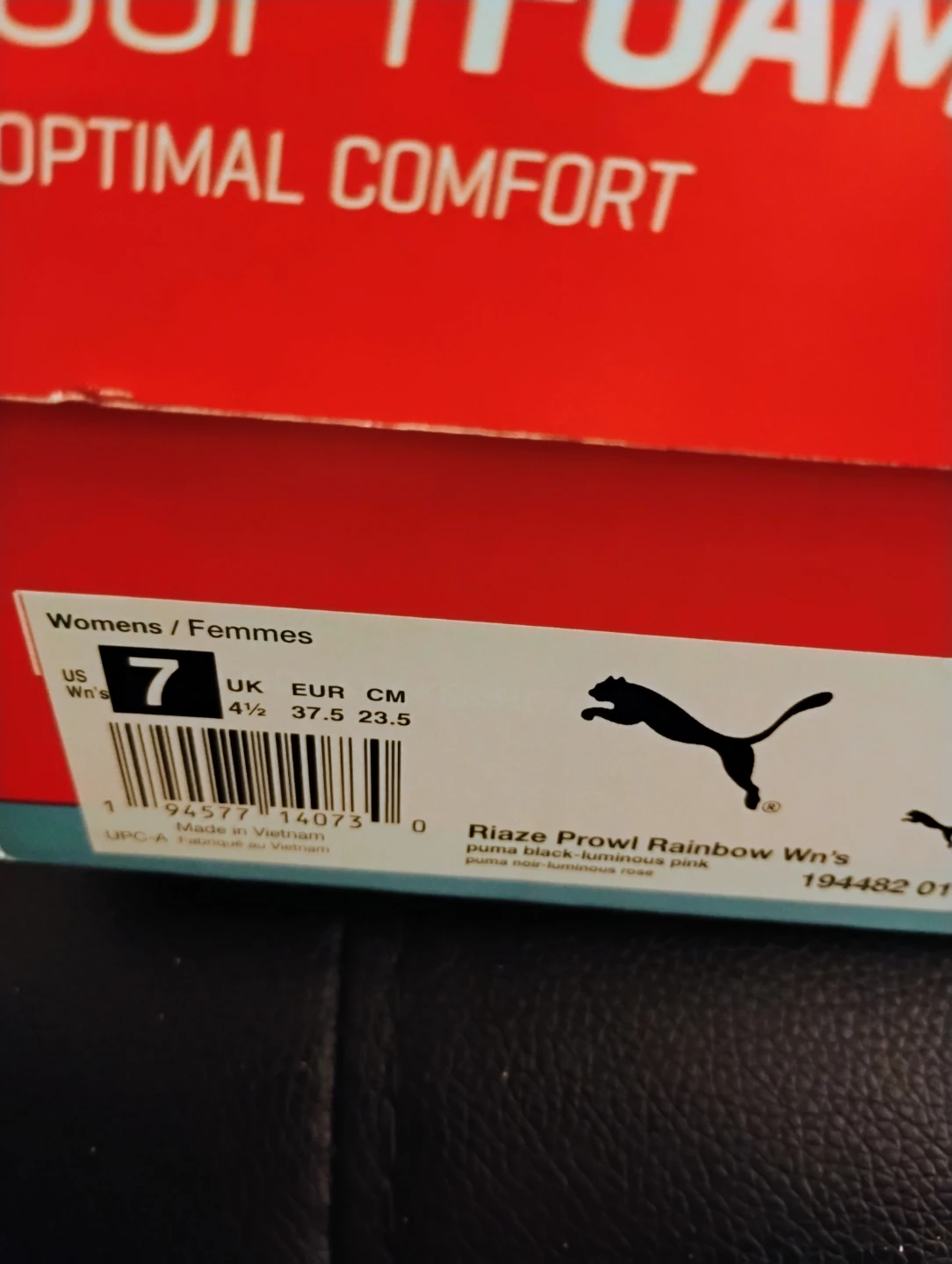 Selling a pair of Puma Riaze Prowl Rainbow Wn's in women's size 7. They are black with luminous pink accents. They feature SOFTFOAM+ for optimal comfort. The original purchase price was $80 and the box is included, used in great condition from a smoke & pet free home. Pickup from Maspeth Queens blks from Long Island Expwy. Check out my other shoes, boots, sandals & sneakers for greater deals on multiple purchases.