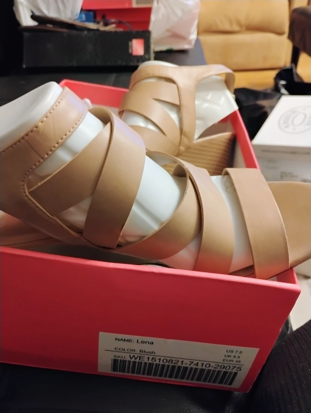 These JustFab Lena wedge sandals are in great condition and come with the original box! They are a beautiful blush (more like a beige or taupe) color and a size 7.5 US. Pickup from Maspeth Queens blks from Long Island Expwy. From a smoke & pet free home, check out my other shoes, boots, sandals & sneakers for greater deals on multiple purchases. Open shoes can fit size 8 too.