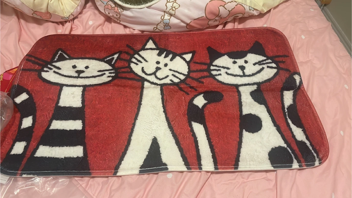 This is a cute bath mat with a fun cat print! It features three adorable cats in different patterns on a red background. Perfect for adding a touch of whimsy to your bathroom