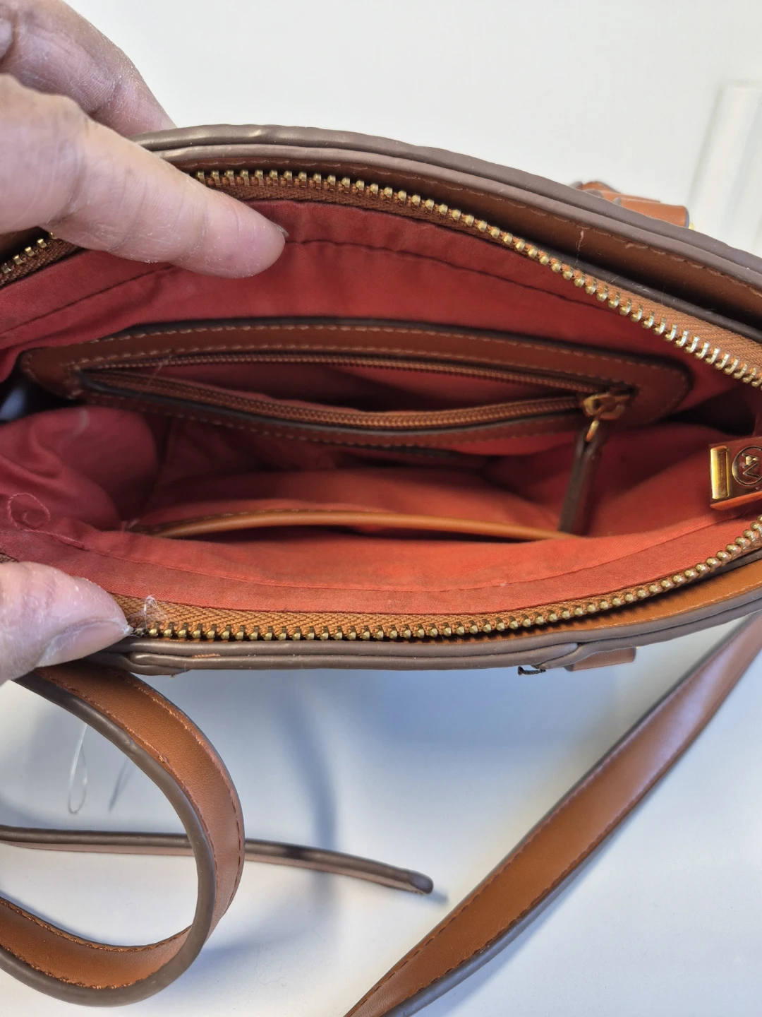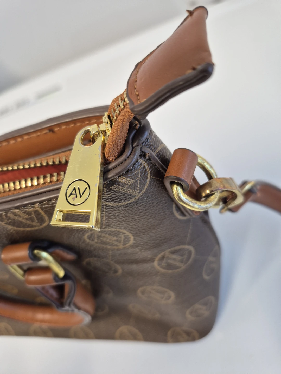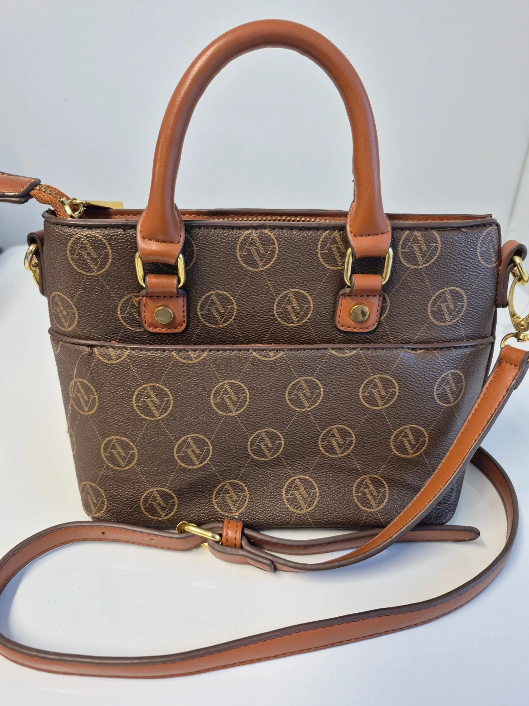 This is a brown Adrienne Vittadini satchel. It features gold hardware and a brown patterned design. The interior is lined with an orange fabric and has multiple pockets for organization