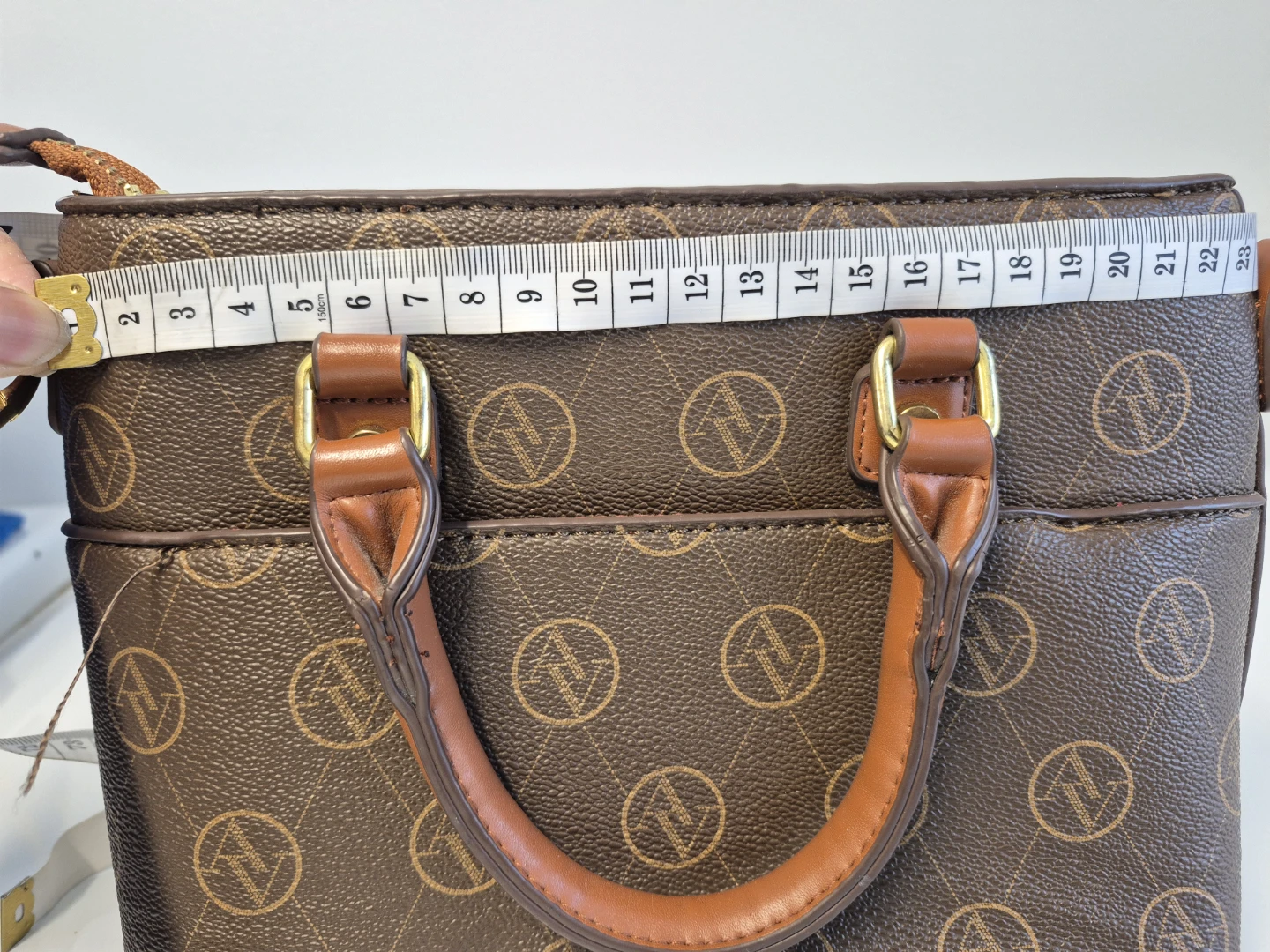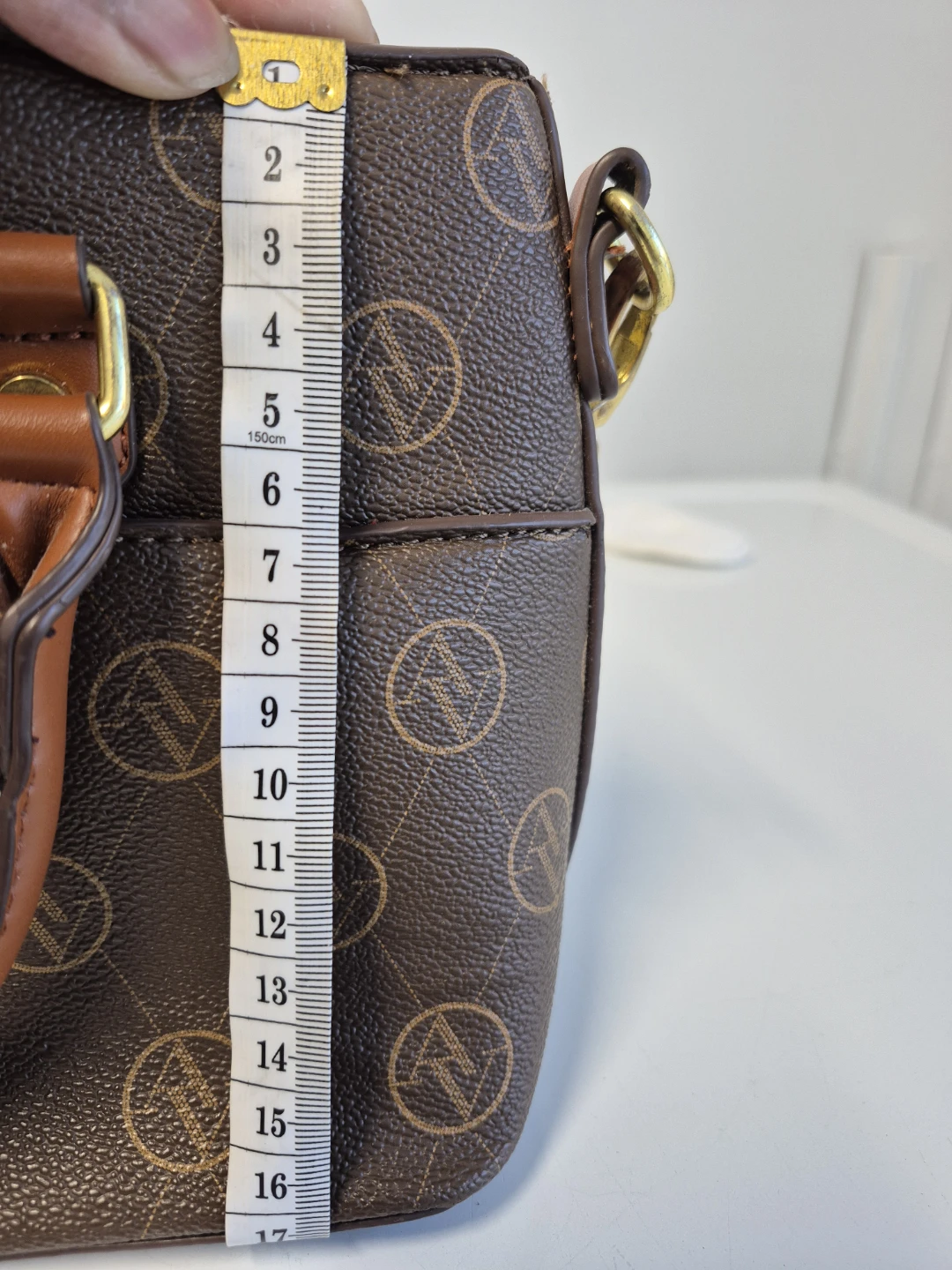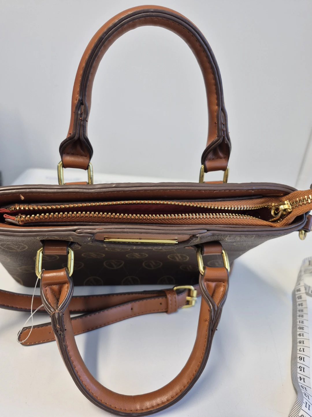 This is a brown Adrienne Vittadini satchel. It features gold hardware and a brown patterned design. The interior is lined with an orange fabric and has multiple pockets for organization