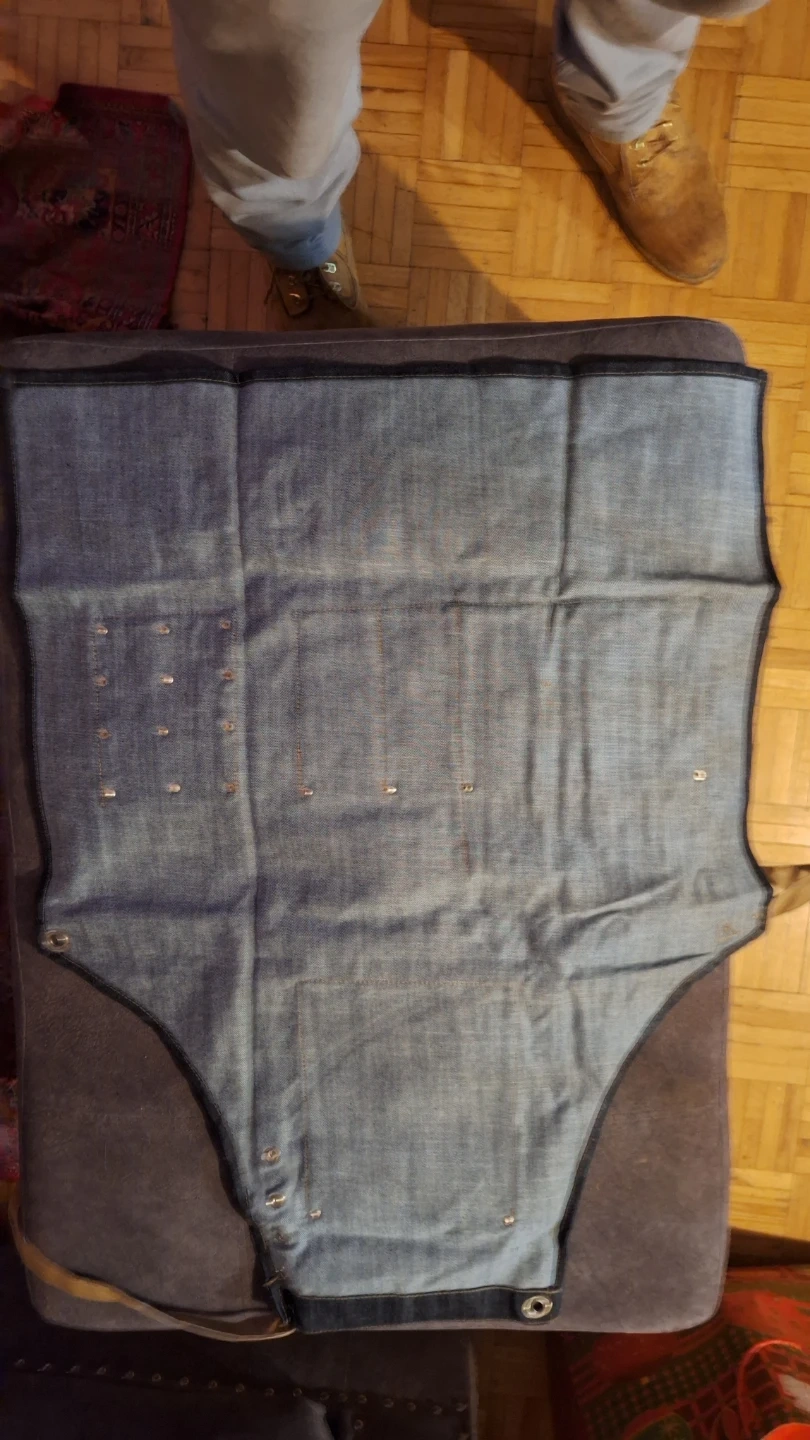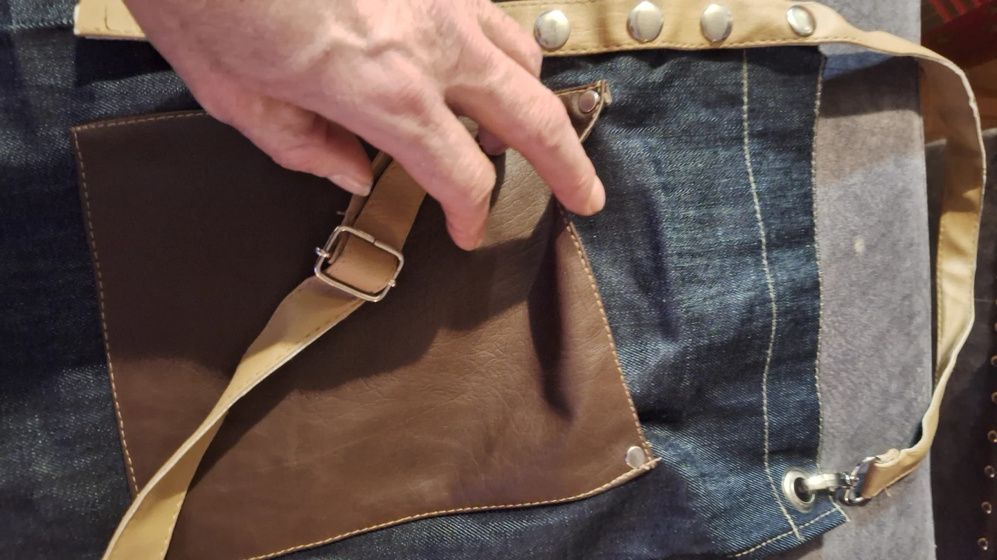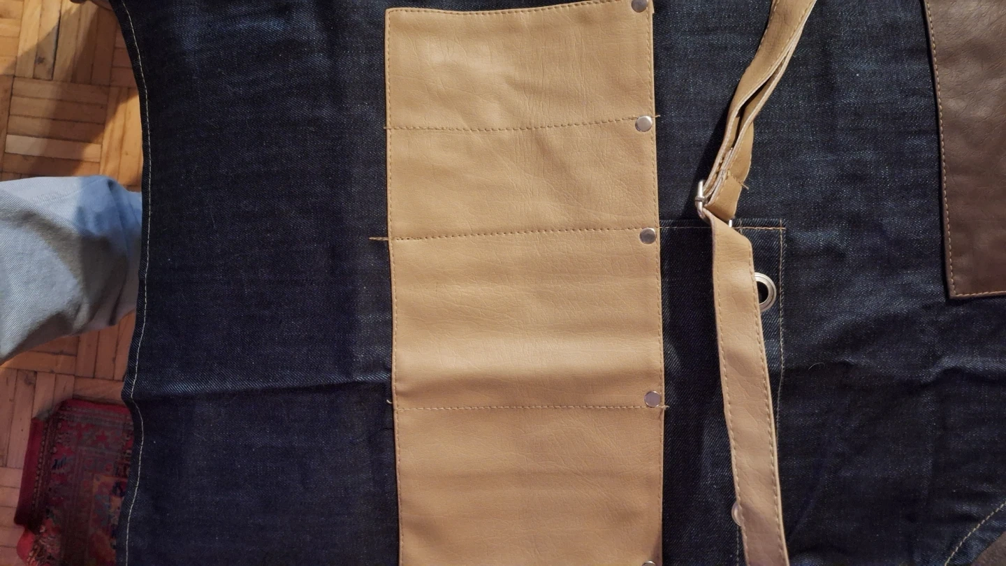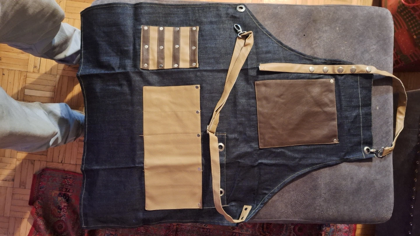 Here's a stylish denim apron with faux leather pockets and accents! It's perfect for cooking, crafting, or any messy activity where you want to protect your clothes. The apron features adjustable straps and multiple pockets for storing tools and accessories