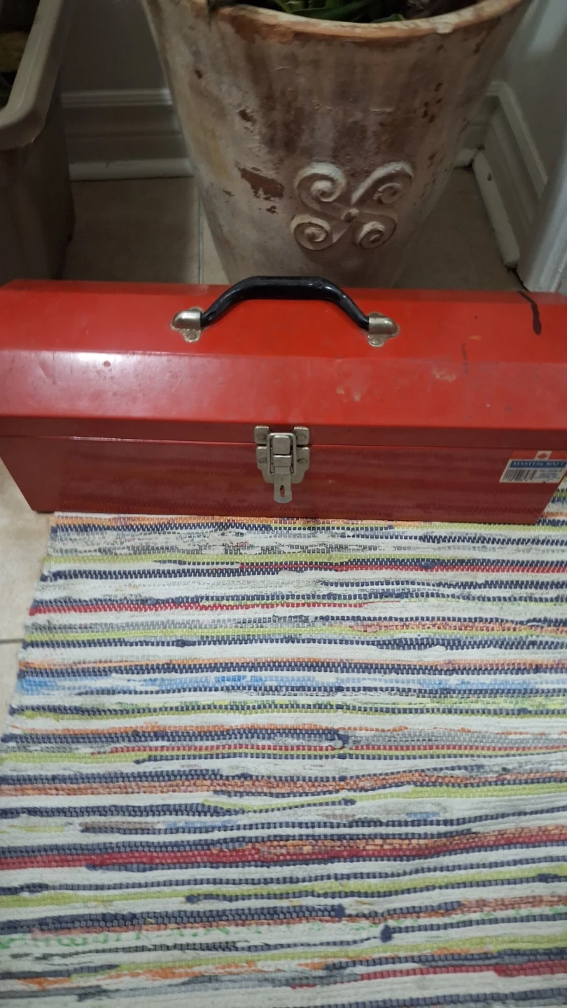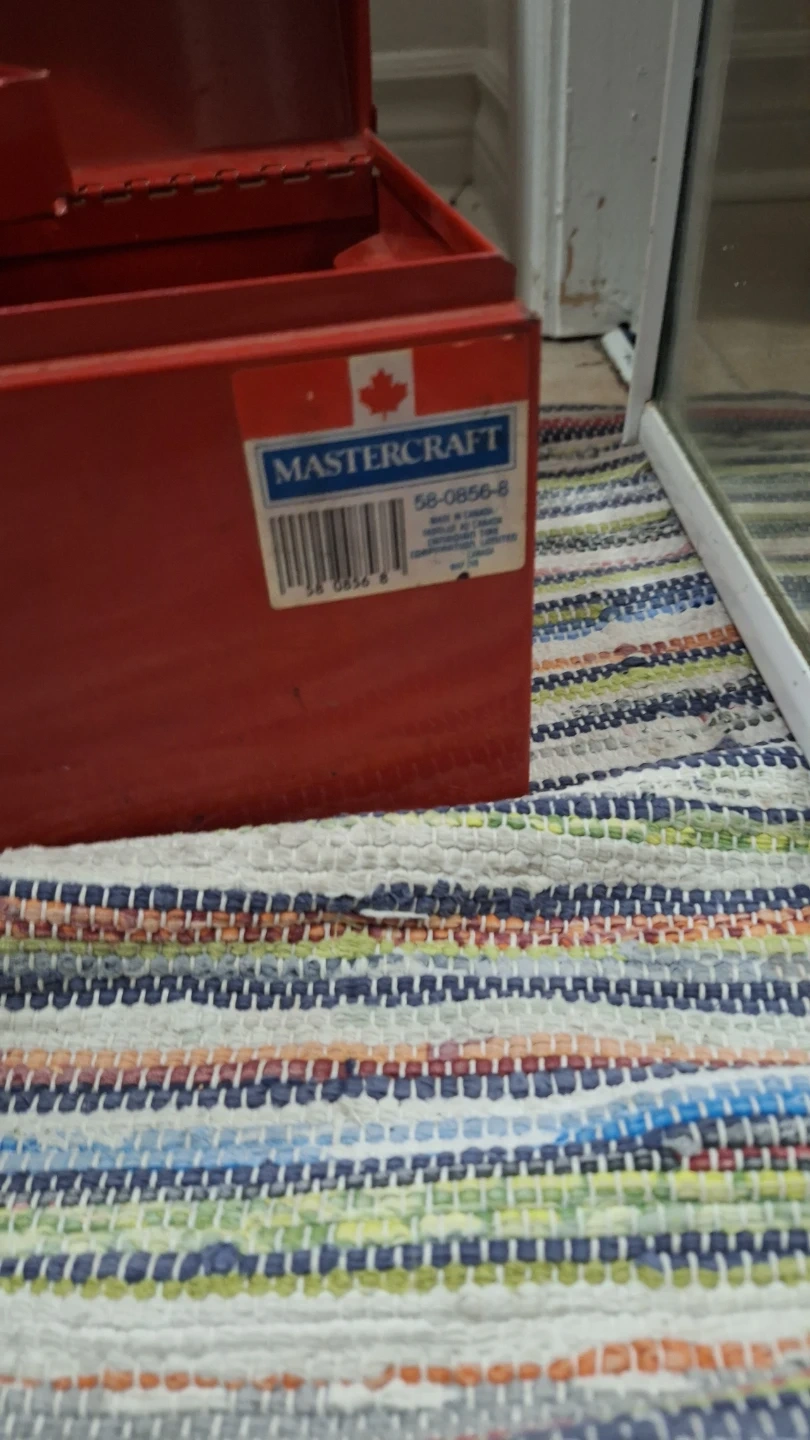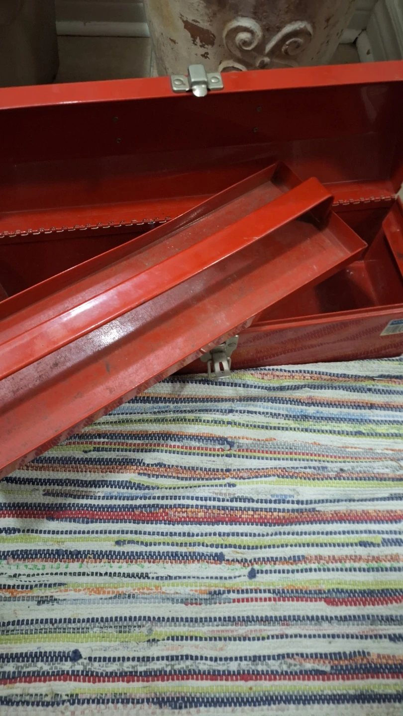 Selling a red metal toolbox from Mastercraft. It has a handle and a latch to keep it closed. Inside, there's a tray to help organize your tools. It's a great way to keep everything tidy!