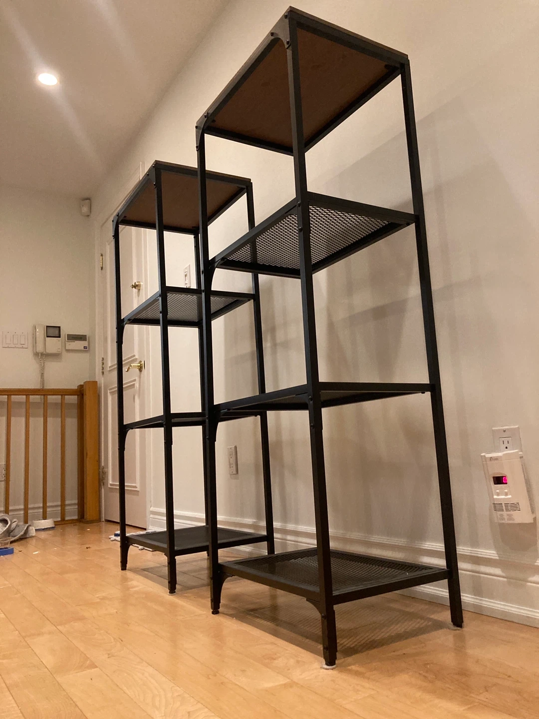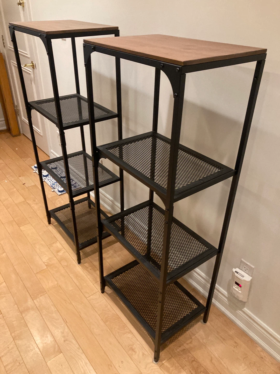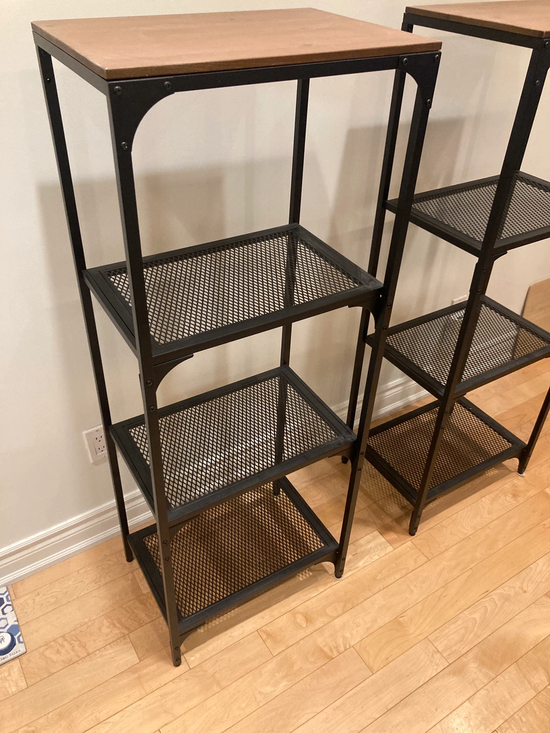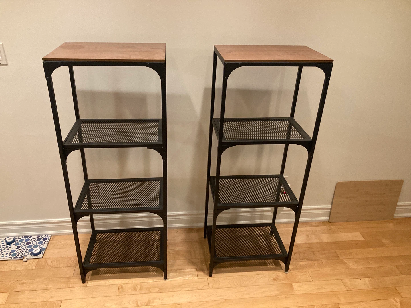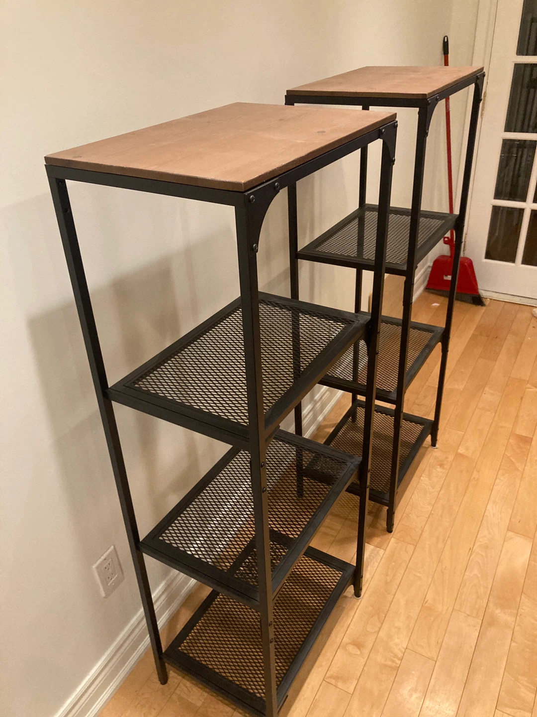 Selling a set of two shelving units! They feature a black metal frame with wooden tops and metal mesh shelves. Great for adding some storage and style to any room in your home