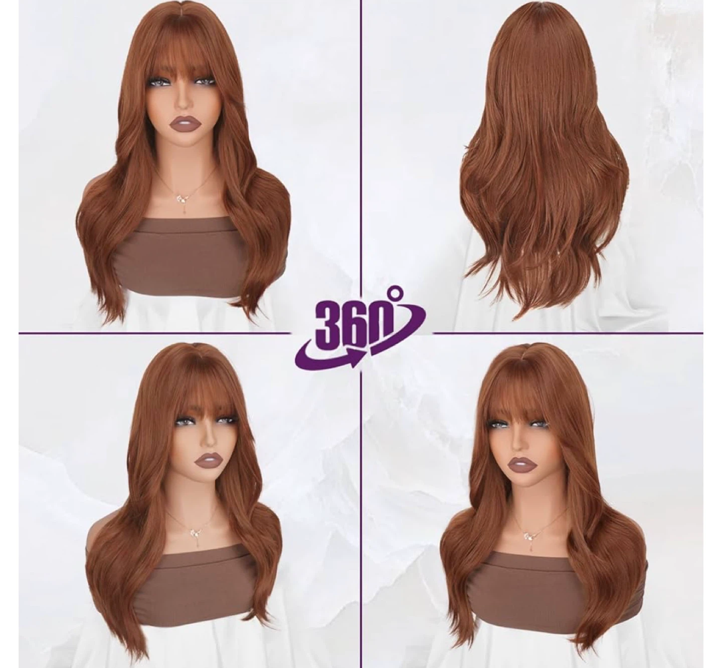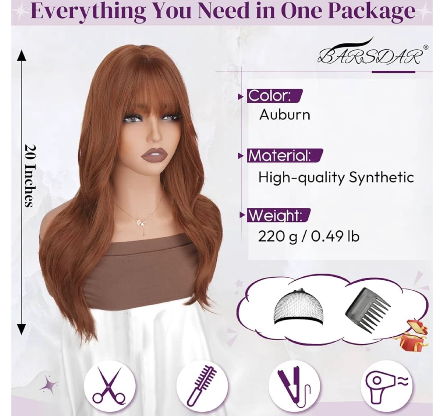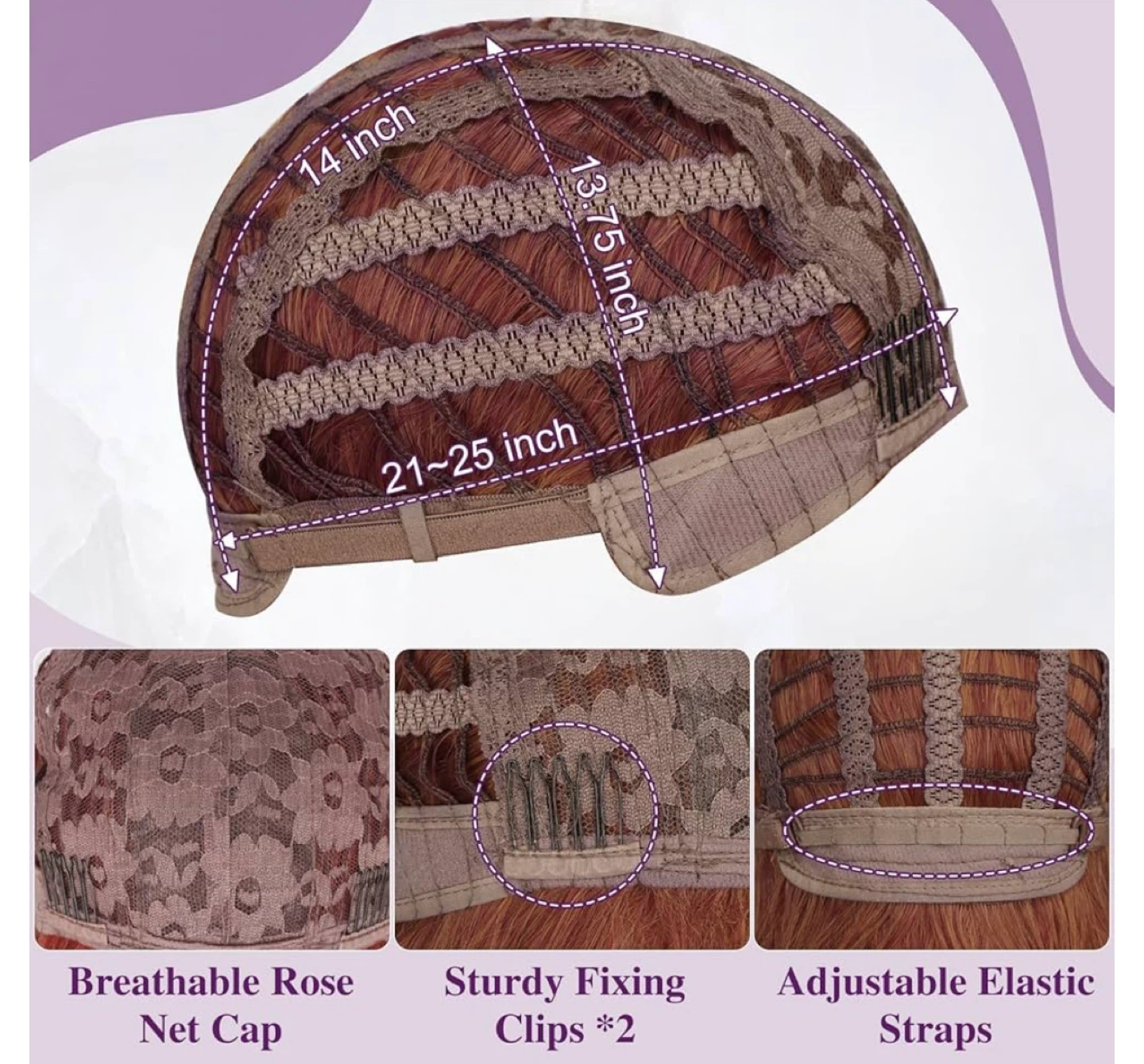 The wig cap is a breathable rose net cap with sturdy fixing clips and adjustable elastic straps for a comfortable and secure fit. It measures 14 inches across the top and 21-25 inches around the head.