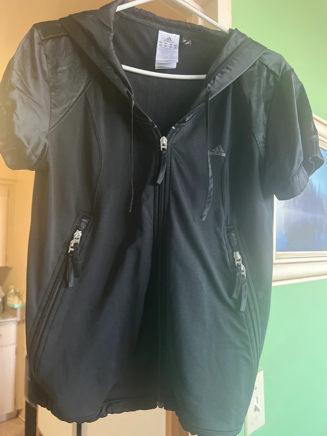 Selling an Adidas Climalite short sleeve hoodie in black, size M. It's in great condition and features a full zip and pockets. Perfect for layering or workouts!