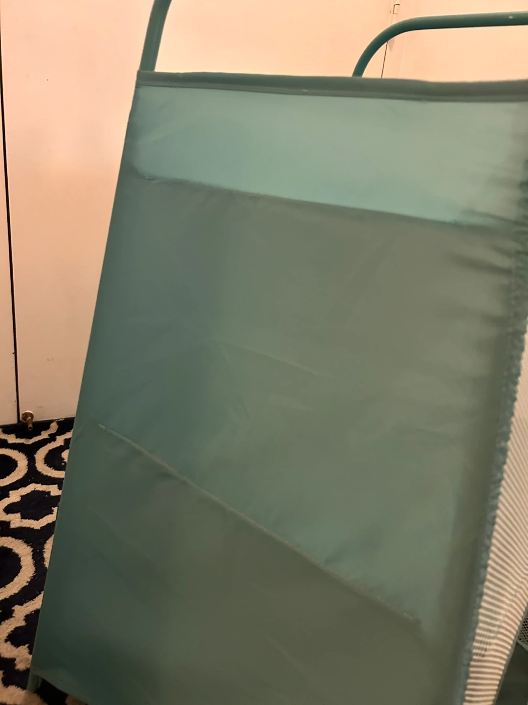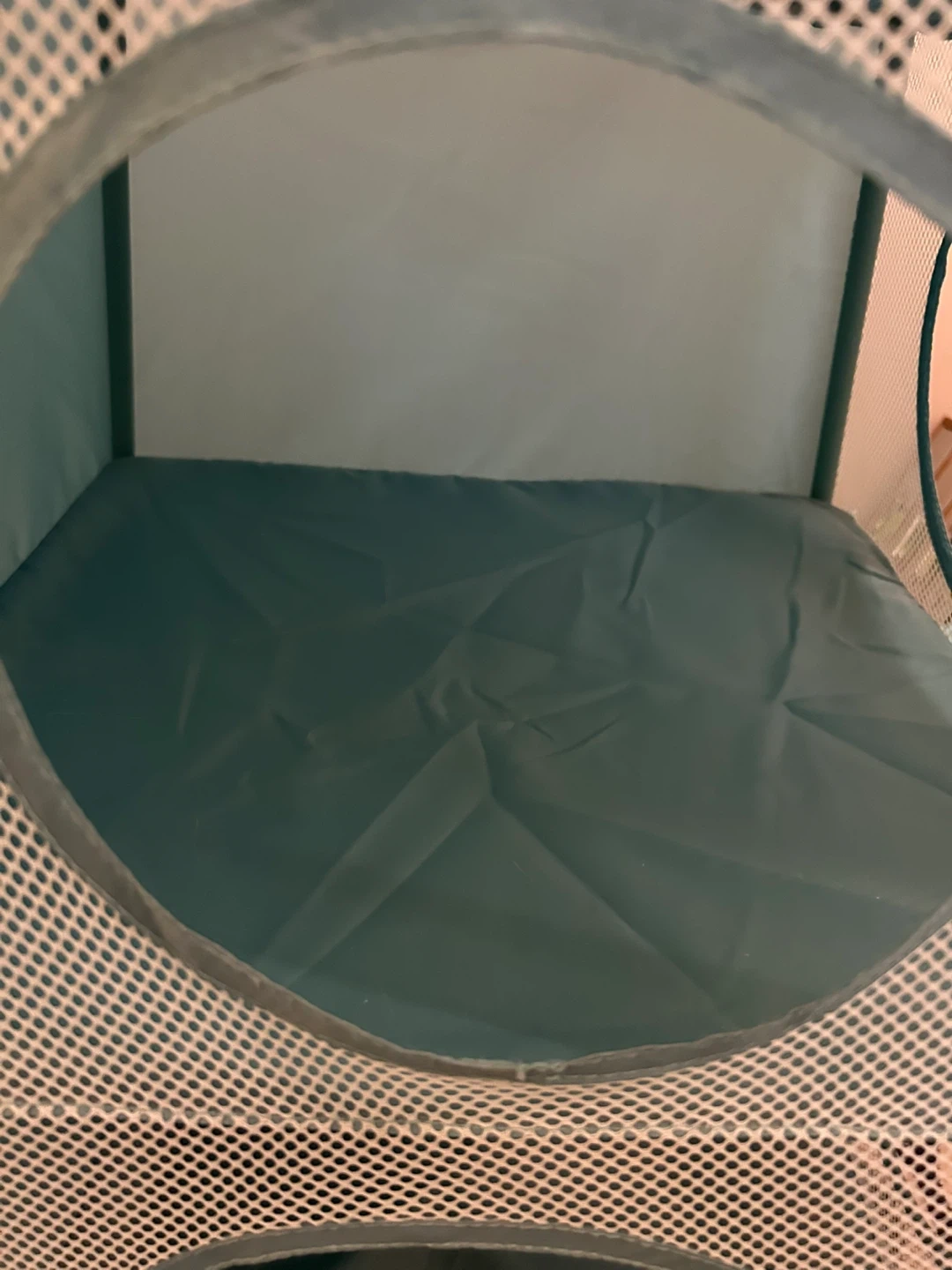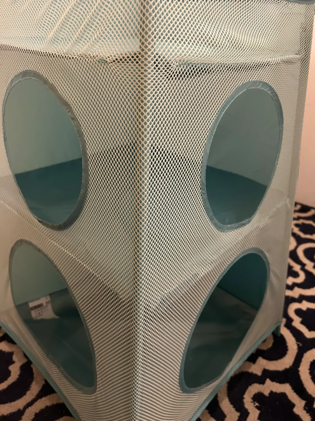 This is a kids' room storage tower, perfect for keeping toys and books organized! It's a nice turquoise colour and made of mesh material. It has a few tiers of storage with circular openings