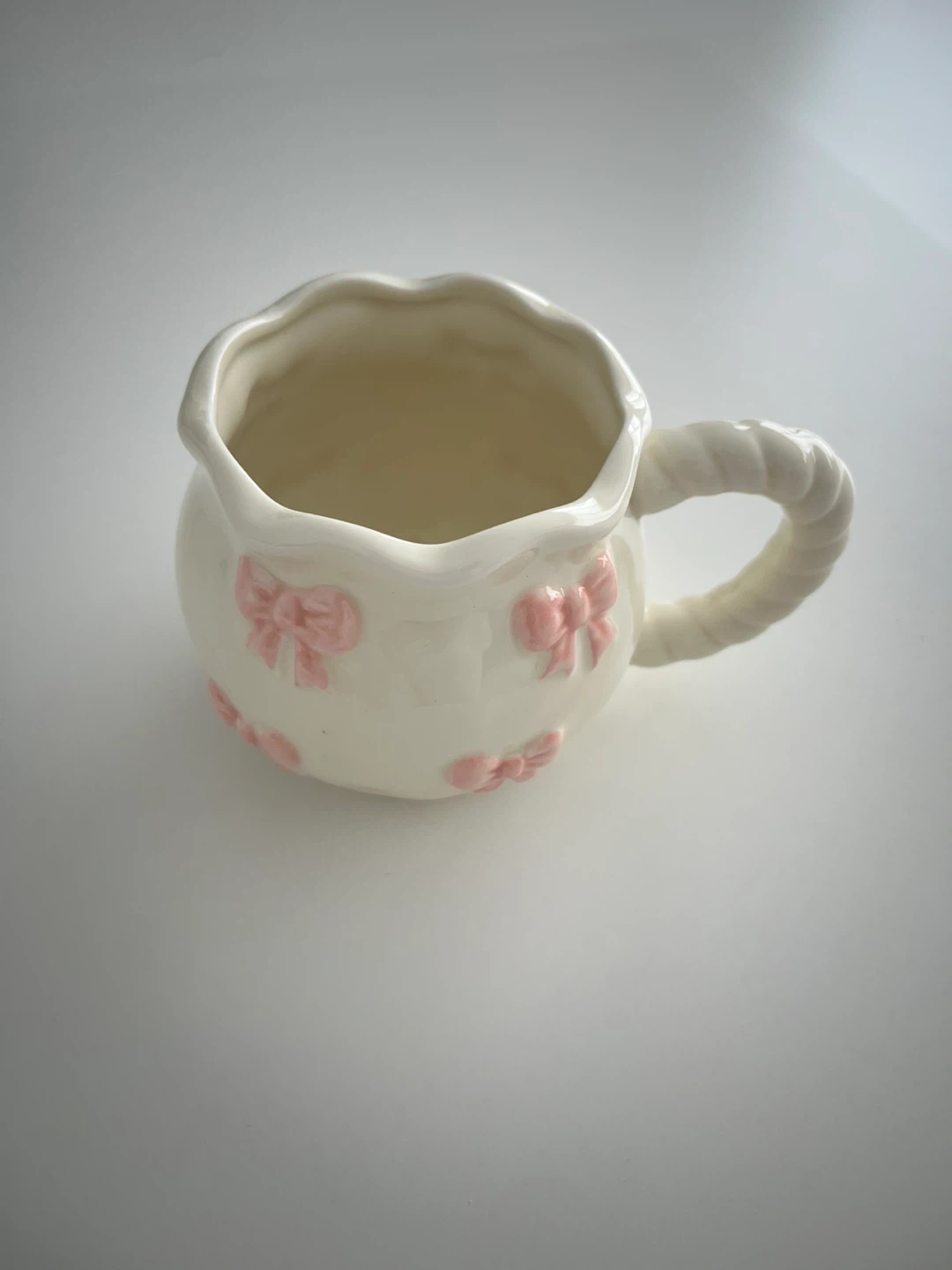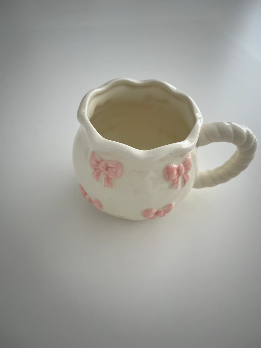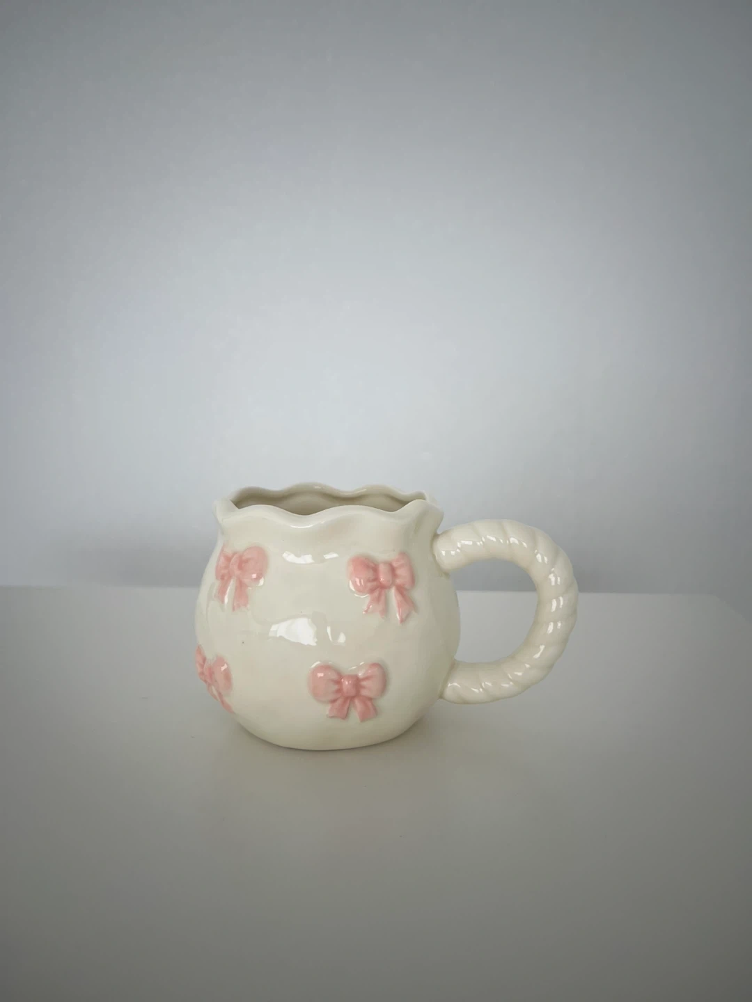 Selling a charming ceramic mug featuring sweet pink bows! It's in great condition and ready to brighten up your morning coffee or tea. The handle has a unique rope design.