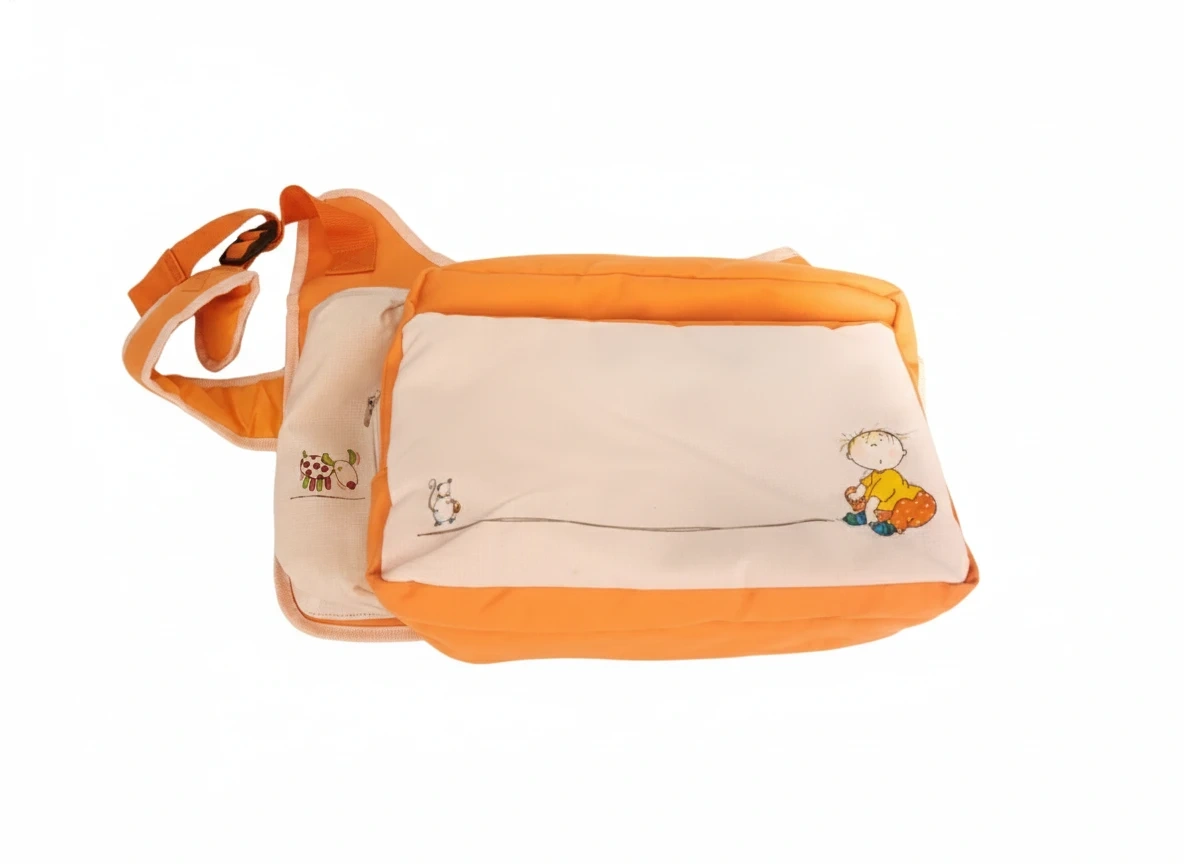 Here's a cute baby diaper bag in orange and white. It features sweet little animal and baby drawings on the front. Perfect for carrying baby essentials on the go!