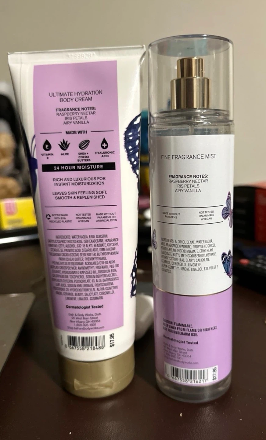 Both items are 8 FL OZ / 236 mL and feature fragrance notes of raspberry nectar, iris petals, and airy vanilla
