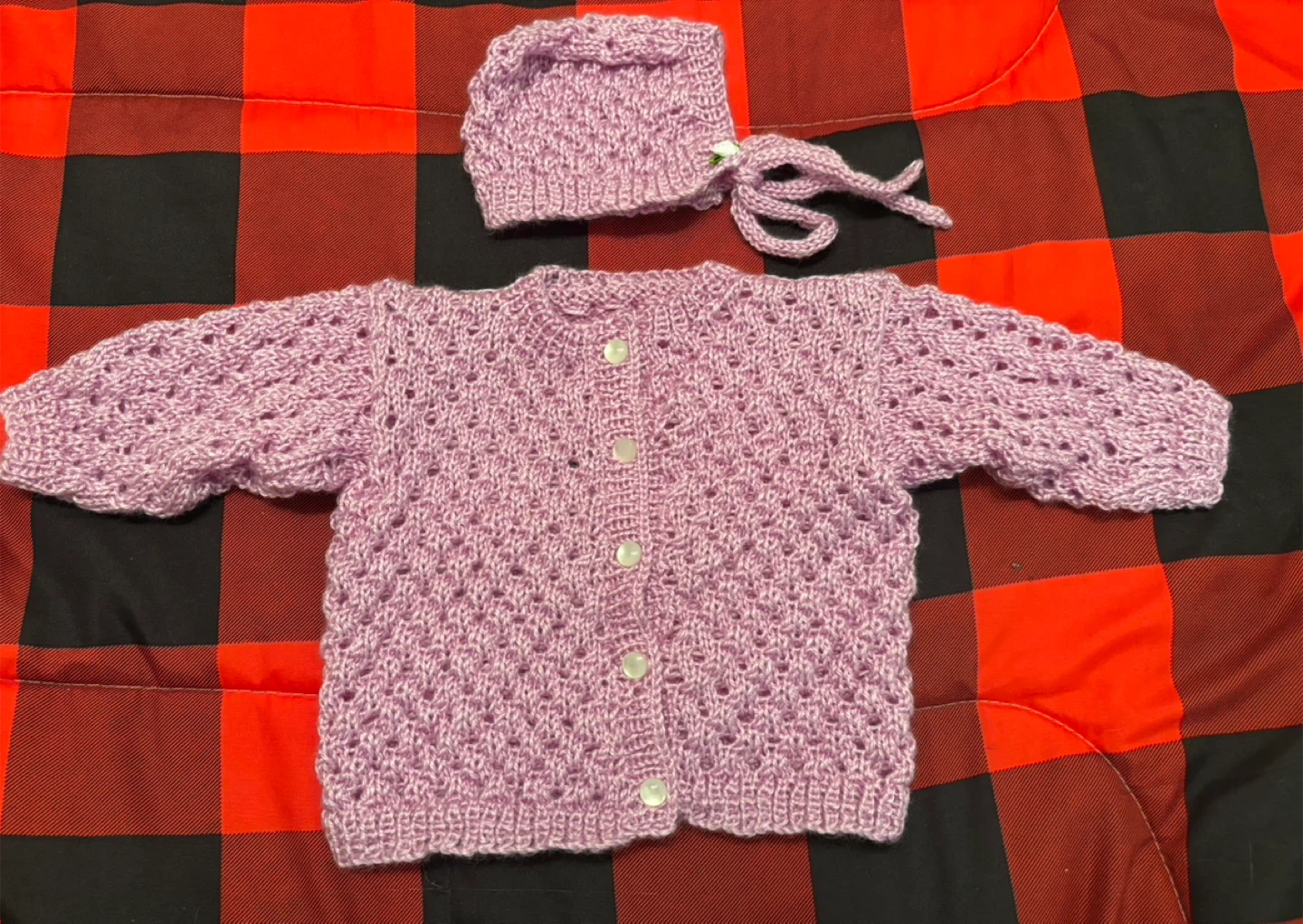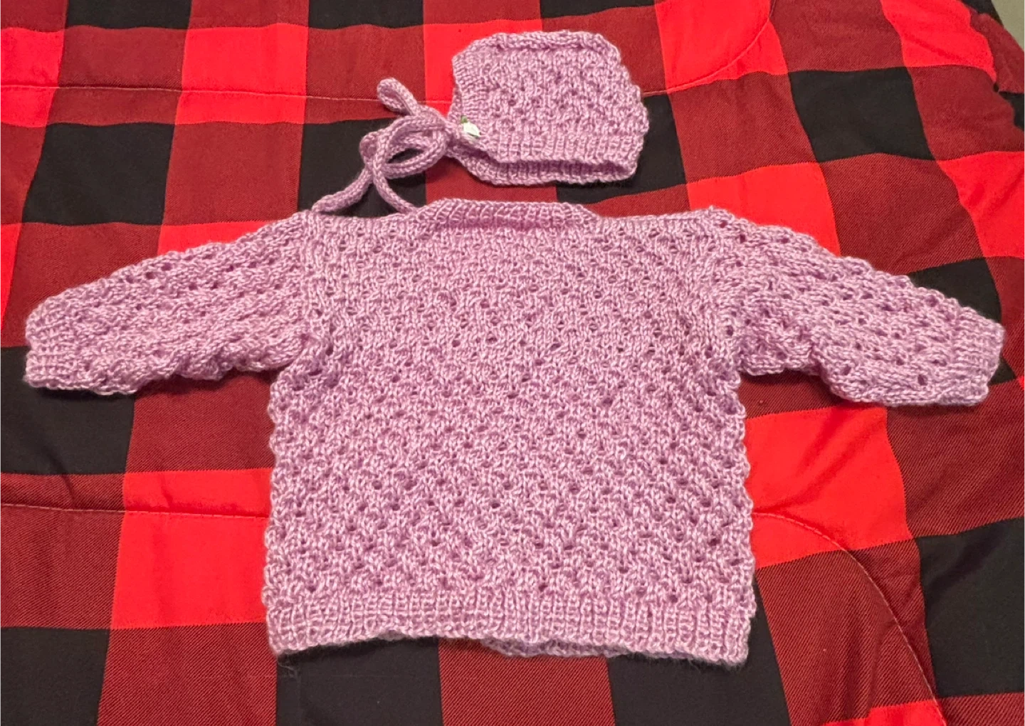 A sweet hand-knitted baby sweater and bonnet set, perfect for keeping your little one cozy! The set is a lovely light purple colour and features a delicate, open-knit design.