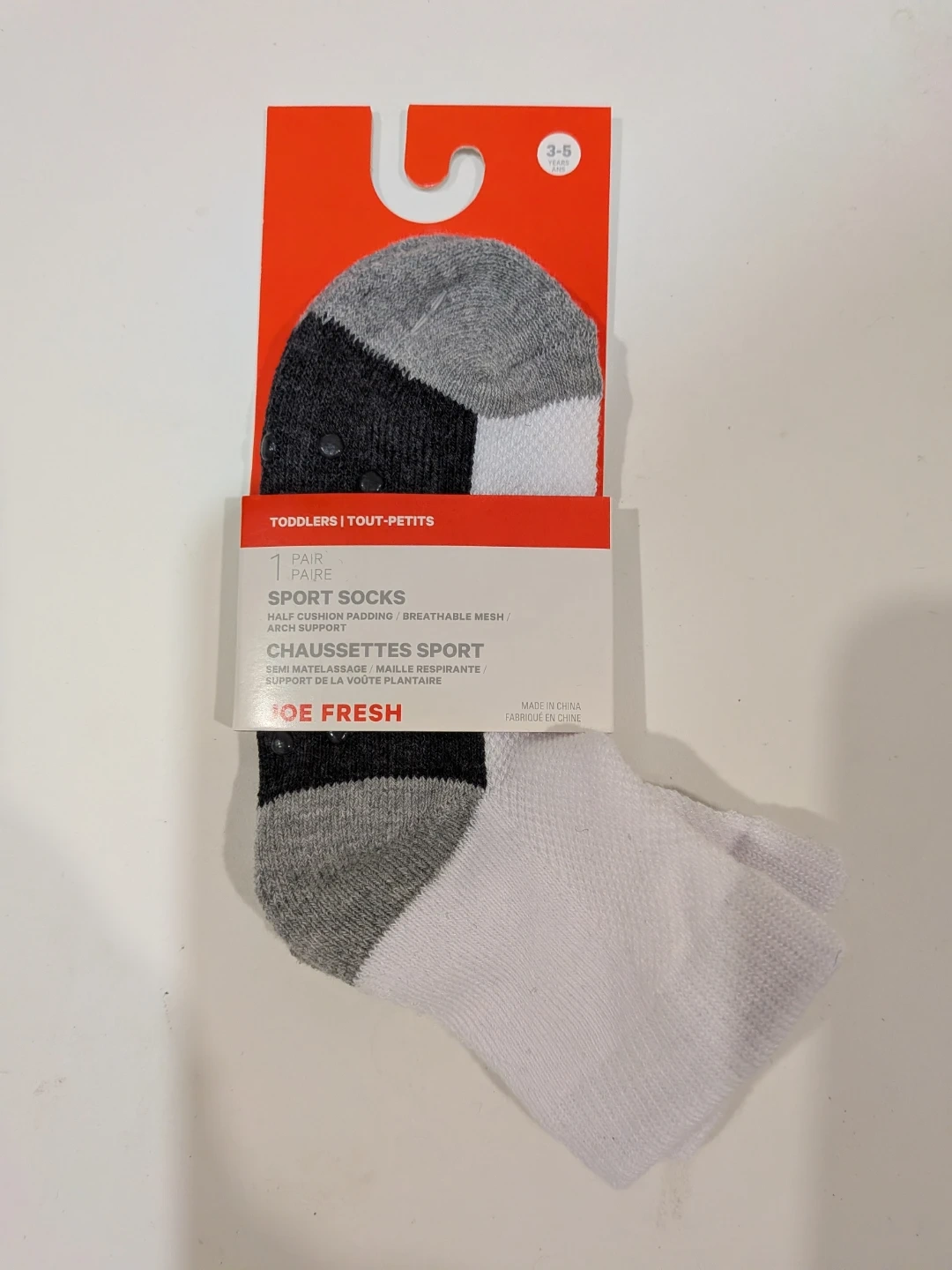 Here's a pair of Joe Fresh sport socks for toddlers! They're size 3-5 and feature half cushion padding and breathable mesh for comfort. They also have arch support. Perfect for your little one!