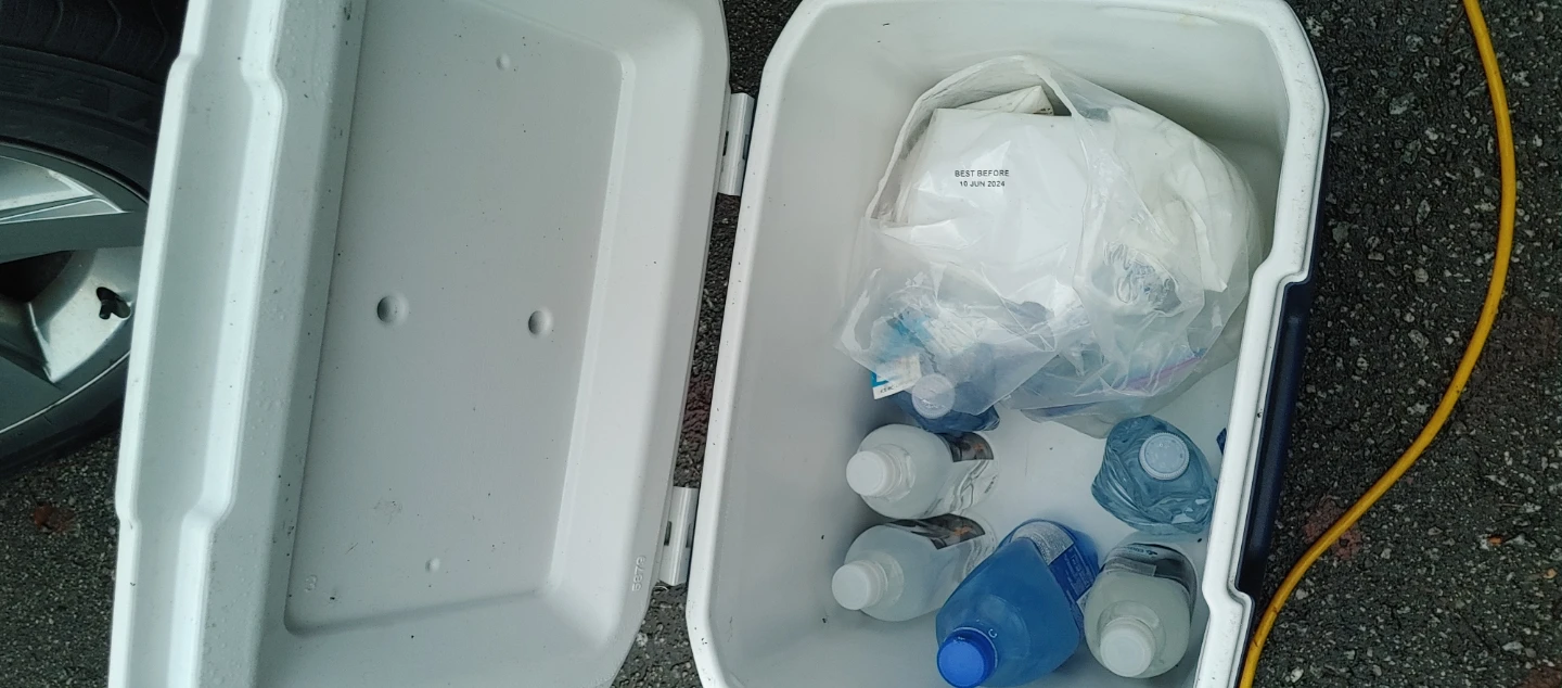 Coleman Cooler with reusable ice packs and water.