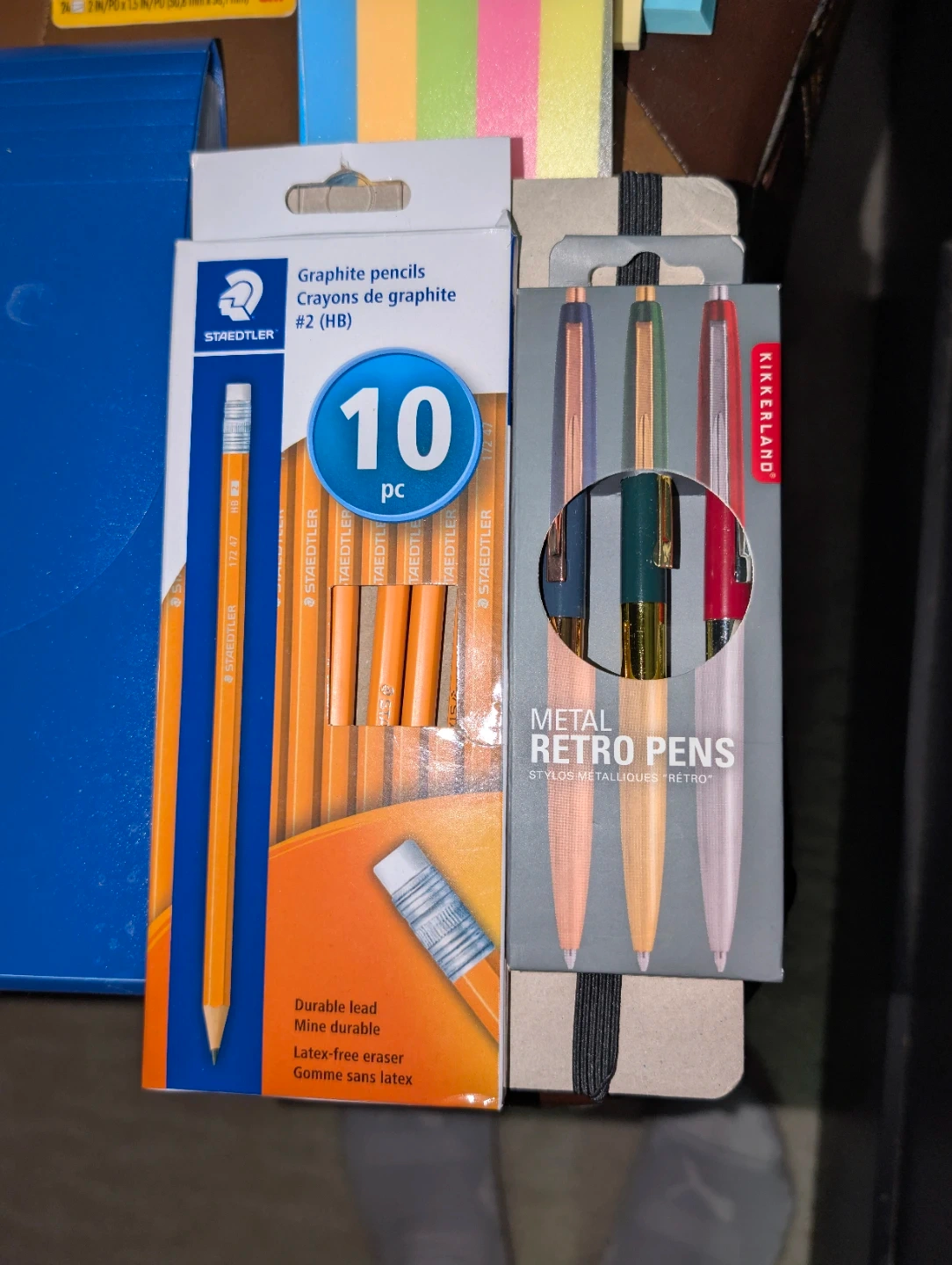 Selling a bundle of stationery items that are great for school, work, or just everyday use! Included are: - Post-it tabs for organizing notes - Notebooks for jotting down ideas - Staedtler graphite pencils - Metal retro pens(brand new price point $11.50) - And more! Set of pencils is missing just 2. Not in photos I have small desk organizer ask to DM for photos. Similar to the ones holding the paper clips and elastic bands but they are white in color, square, another in blueish in color too.
