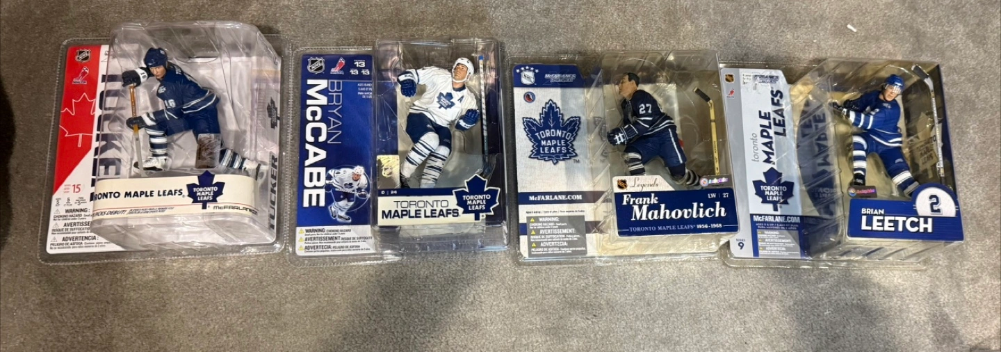 Selling a collection of Toronto Maple Leafs McFarlane hockey figures. The collection includes Darcy Tucker, Bryan McCabe, and Brian Leetch figures, all still in their original packaging, all 4 for $30