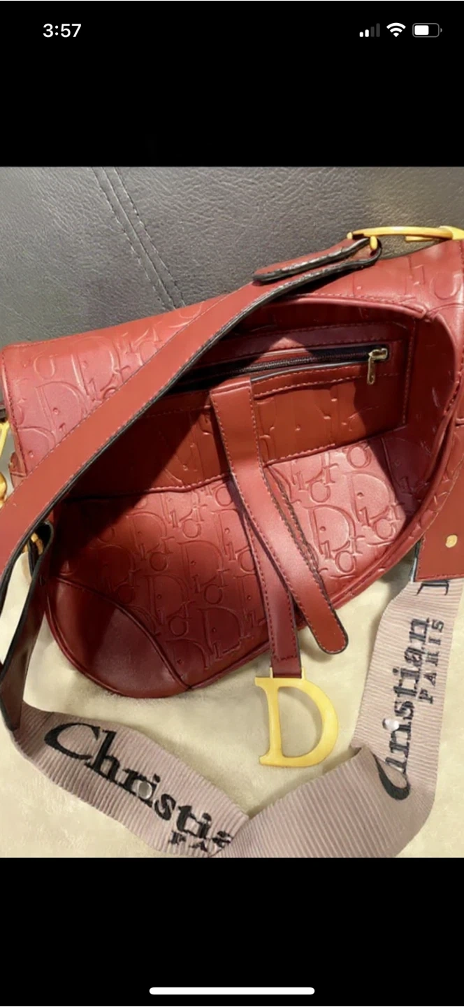 Brand New Dior Saddle Bag, featuring a distinctive saddle shape and the iconic Dior Oblique pattern embossed on the leather. The bag comes with a 'Christian Dior Paris' shoulder strap, adding a touch of modern elegance. It's a stylish and recognizable piece, perfect for adding a chic touch to any outfit.