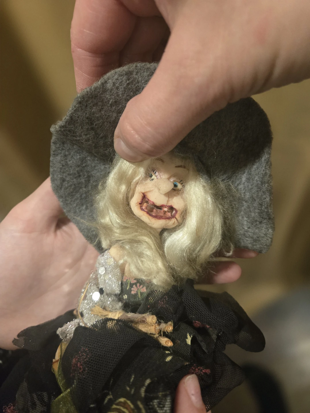 This is a unique, handmade witch doll. She has a grey felt hat with a butterfly embellishment and a black dress. She's a bit spooky, but also kind of cute!
