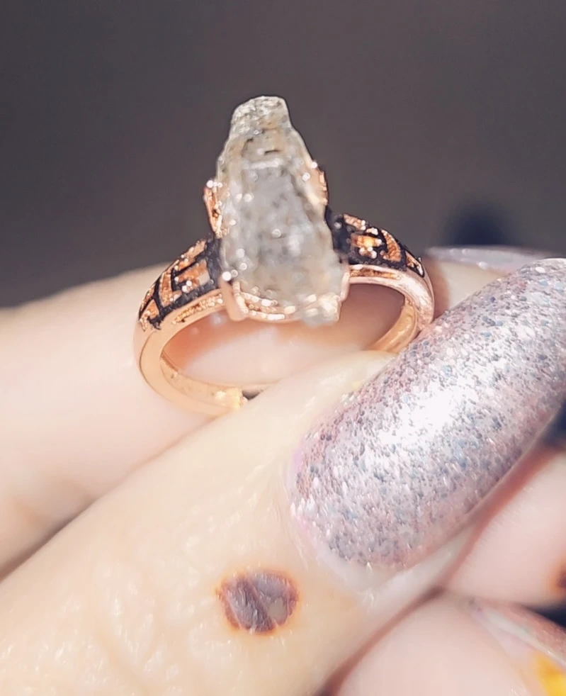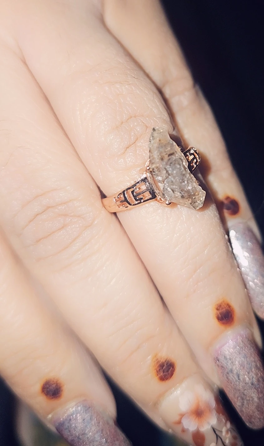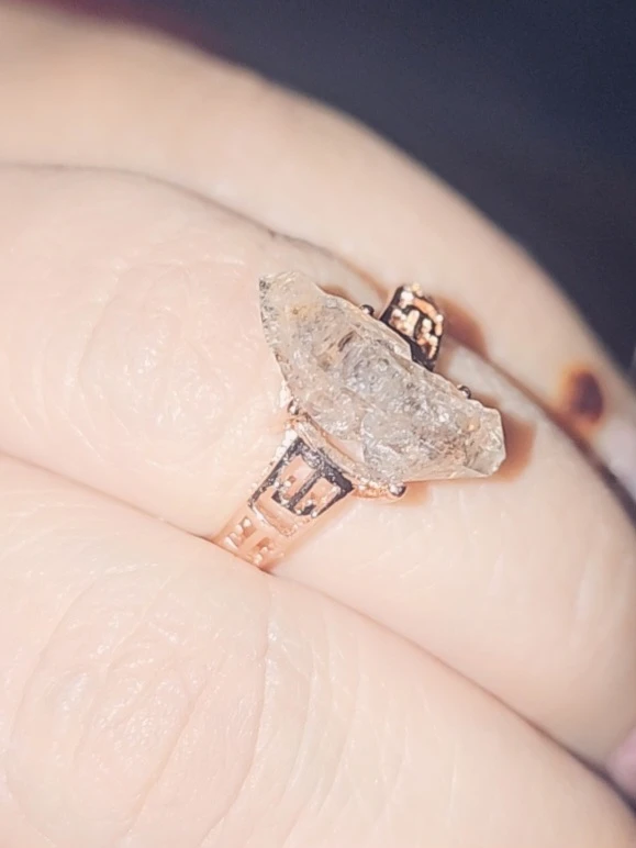 A Herkimer diamond is a rare double-terminated (two-pointed quartz crystal found in Herkimer County, New York, named for its exceptional clarity and diamond-like sparkle, though it's not a true siamond. Formed over 500 million years ago in dolomite pockets, these quartz crystals naturally feature 18 facets and are prized by collectors and jewelers for their beauty, spiritual properties, and use in unique conflict-free iewelry. It's brand new in rose gold copper setting and ready to add a touch of natural beauty to your jewellery collection!
