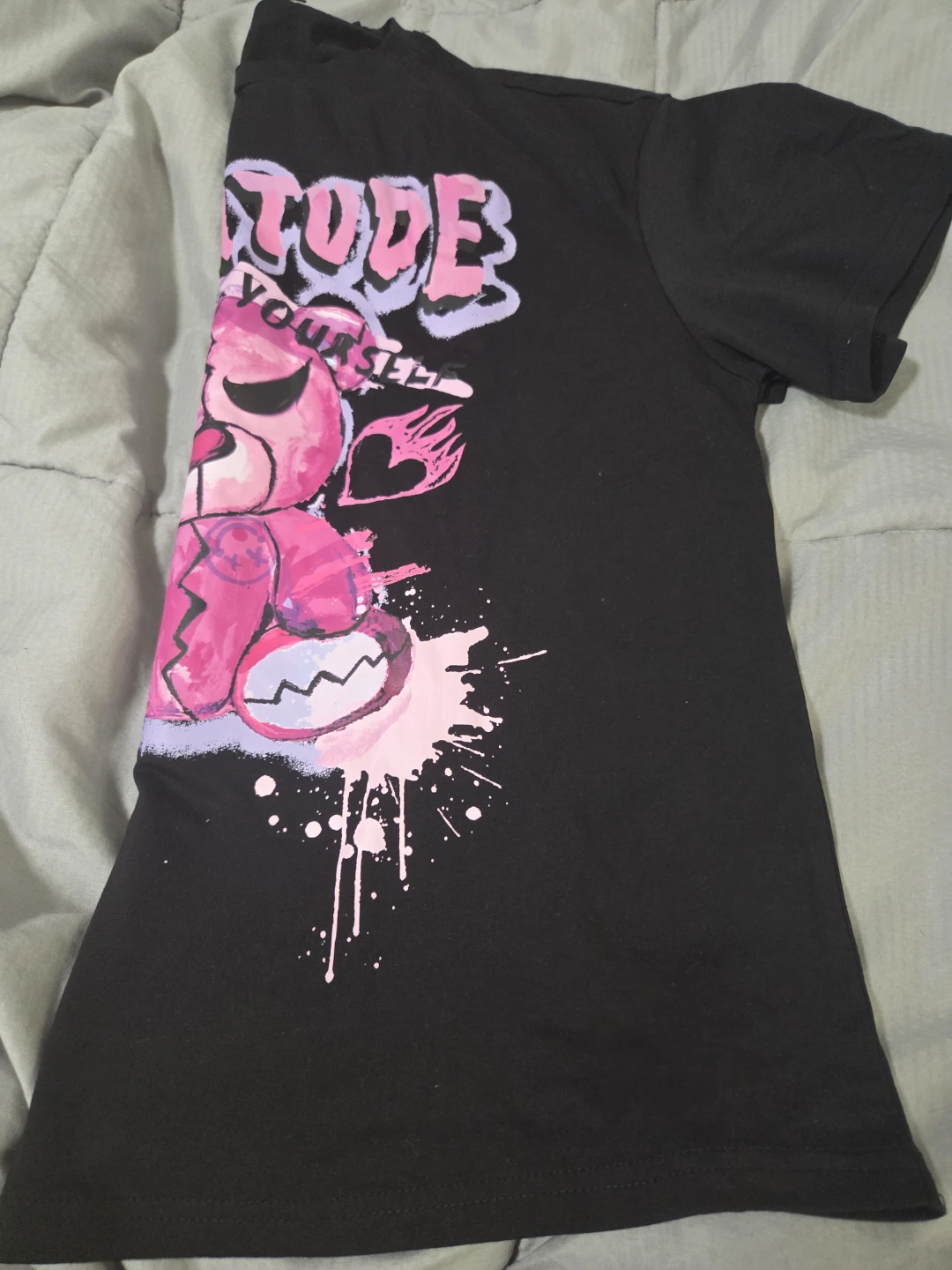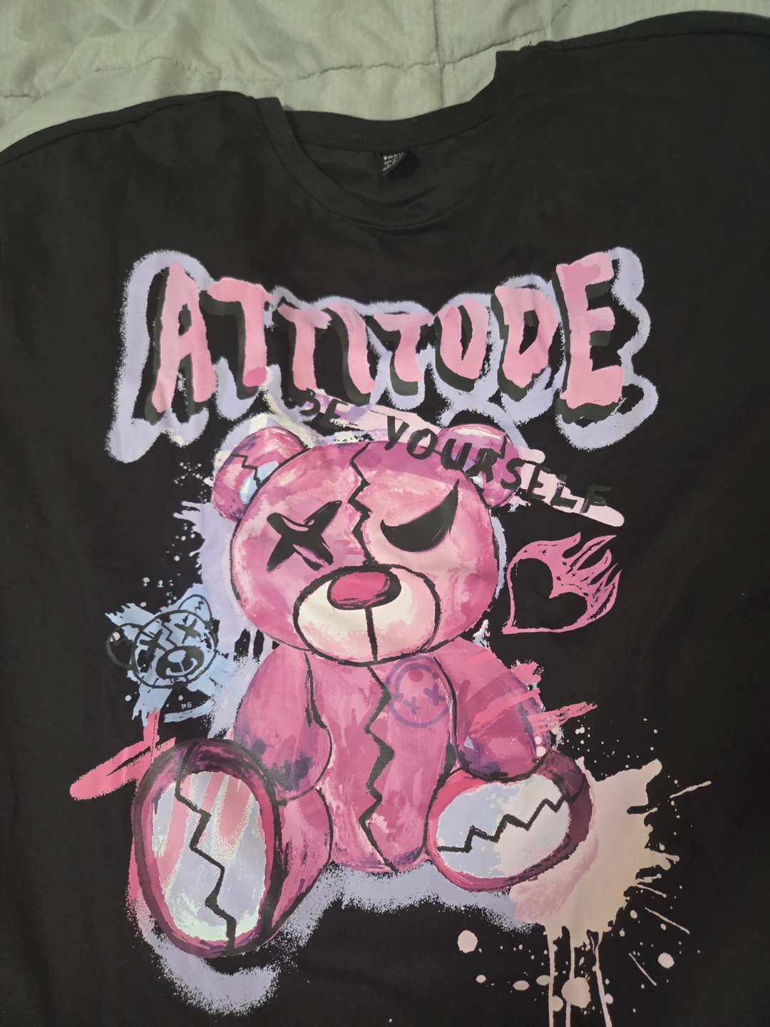 Cute black t-shirt with a fun "Attitude" bear graphic! The design features a pink bear with some cool details. Perfect for casual wear and adding a bit of edge to your outfit