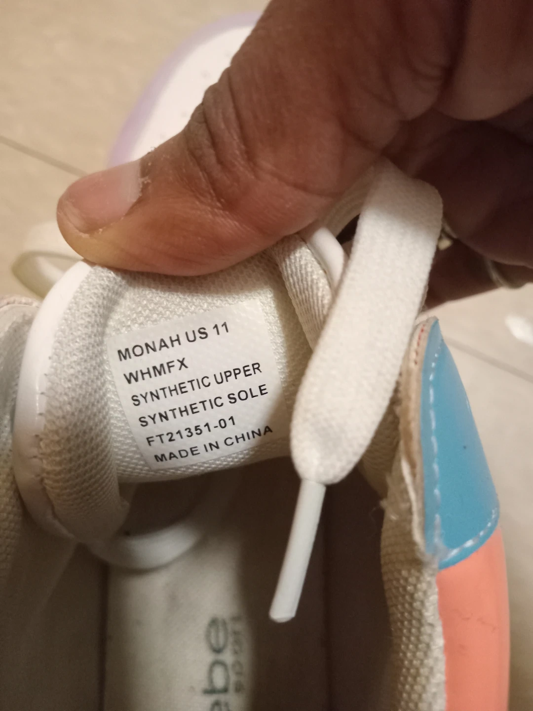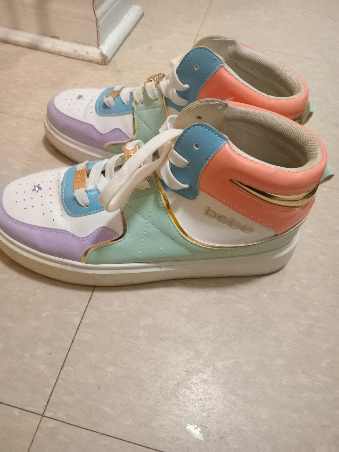 Selling a pair of Bebe Sport Monah sneakers in US size 11. They feature a synthetic upper and sole. The colour combination includes white, pastel purple, mint green, and peach accents. Jane and Finch pick up.