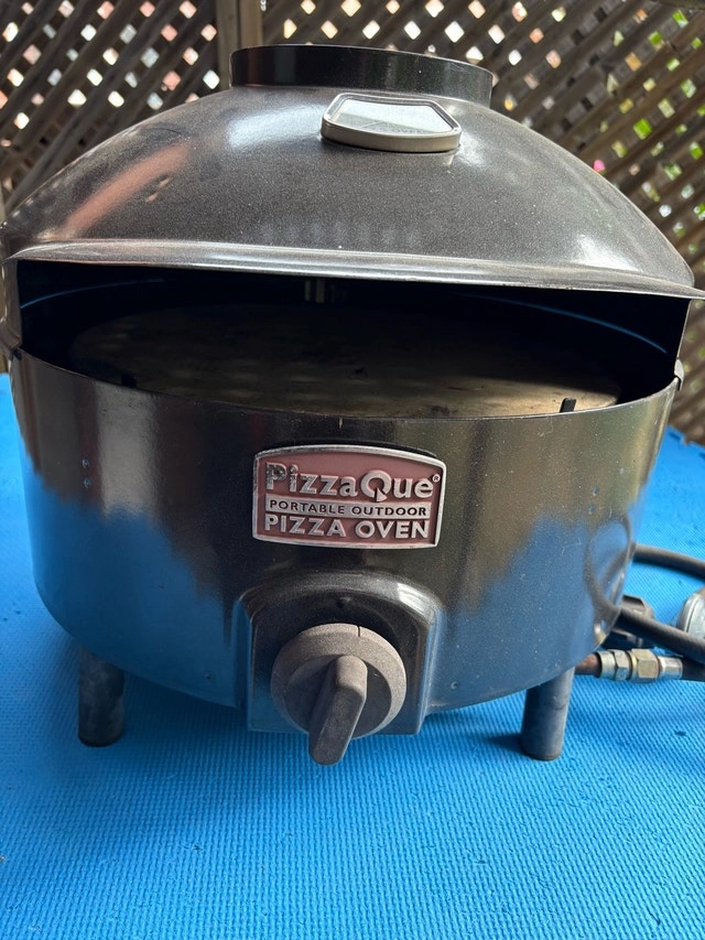 Get ready to bake the perfect pizza outdoors with this PizzaQue portable pizza oven! This used oven is in good working condition and heats up quickly for delicious, wood-fired flavour in minutes. It features a built-in thermometer and a ceramic pizza stone for even cooking.