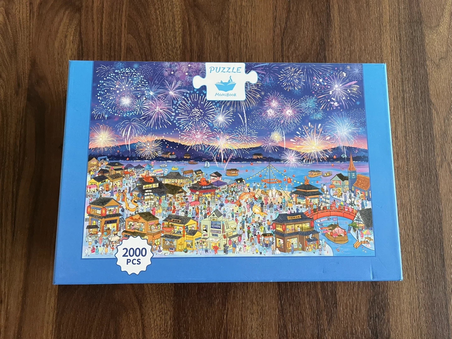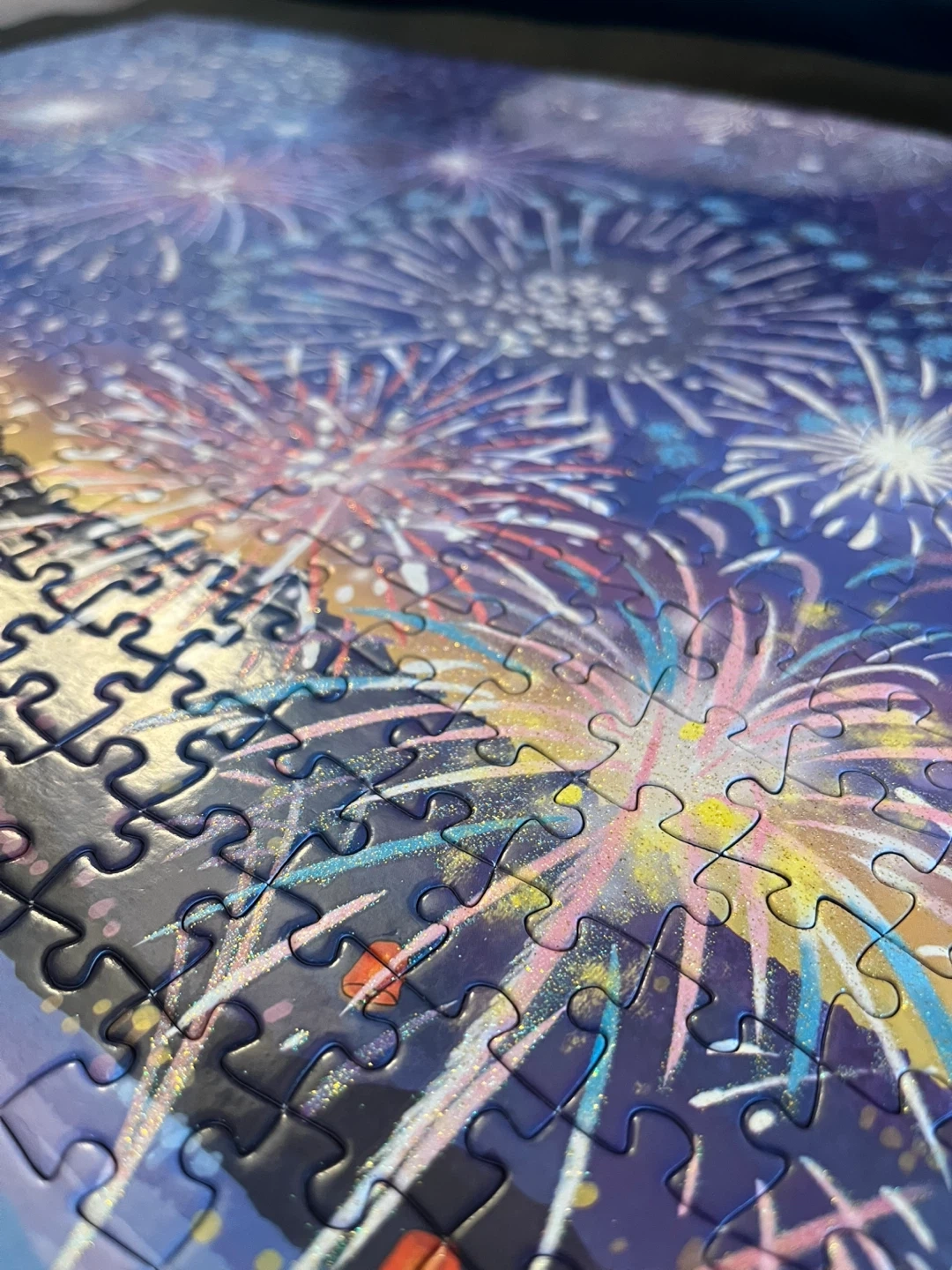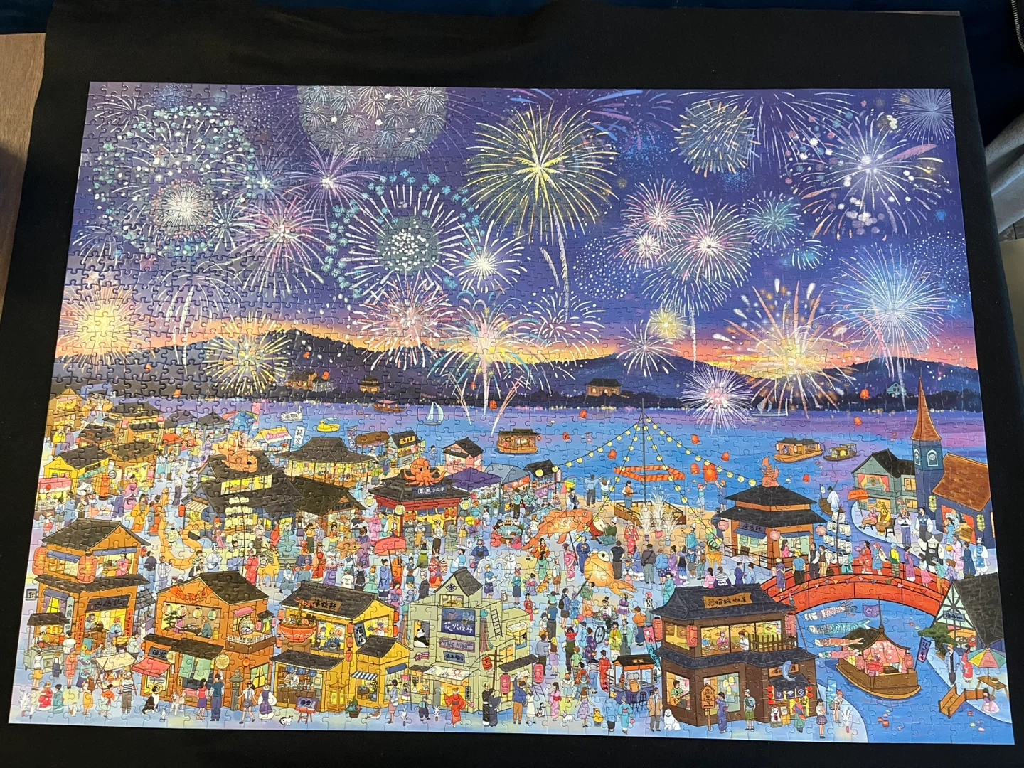 A vibrant illustrated puzzle capturing a joyful night festival by the water, illuminated by dazzling fireworks in the summer sky. Crowded streets, glowing lanterns, colorful stalls, and reflections dancing across the lake come together to create a lively yet magical atmosphere. Rich details and layered colors (with glitter!!) make this puzzle both visually stunning and satisfyingly challenging. From the bursting fireworks above to the bustling festival scene below, every section invites you to slow down and enjoy the process. Perfect for puzzle lovers who enjoy detailed city scenes, festival vibes, and immersive puzzling experiences—whether for a relaxing evening or as a thoughtful gift.