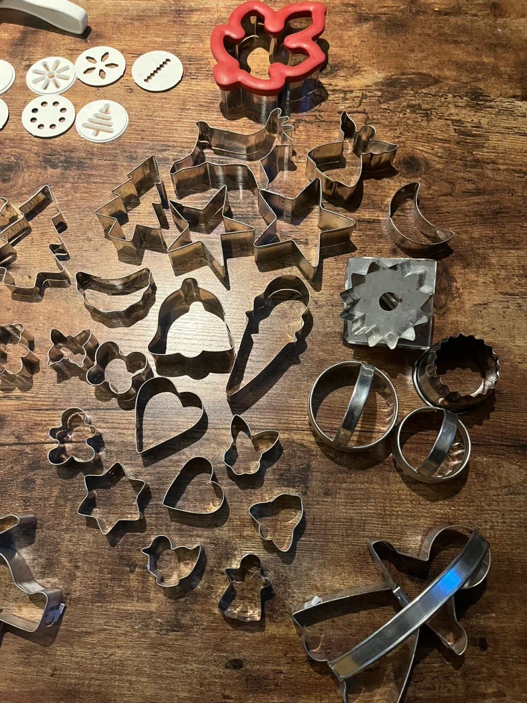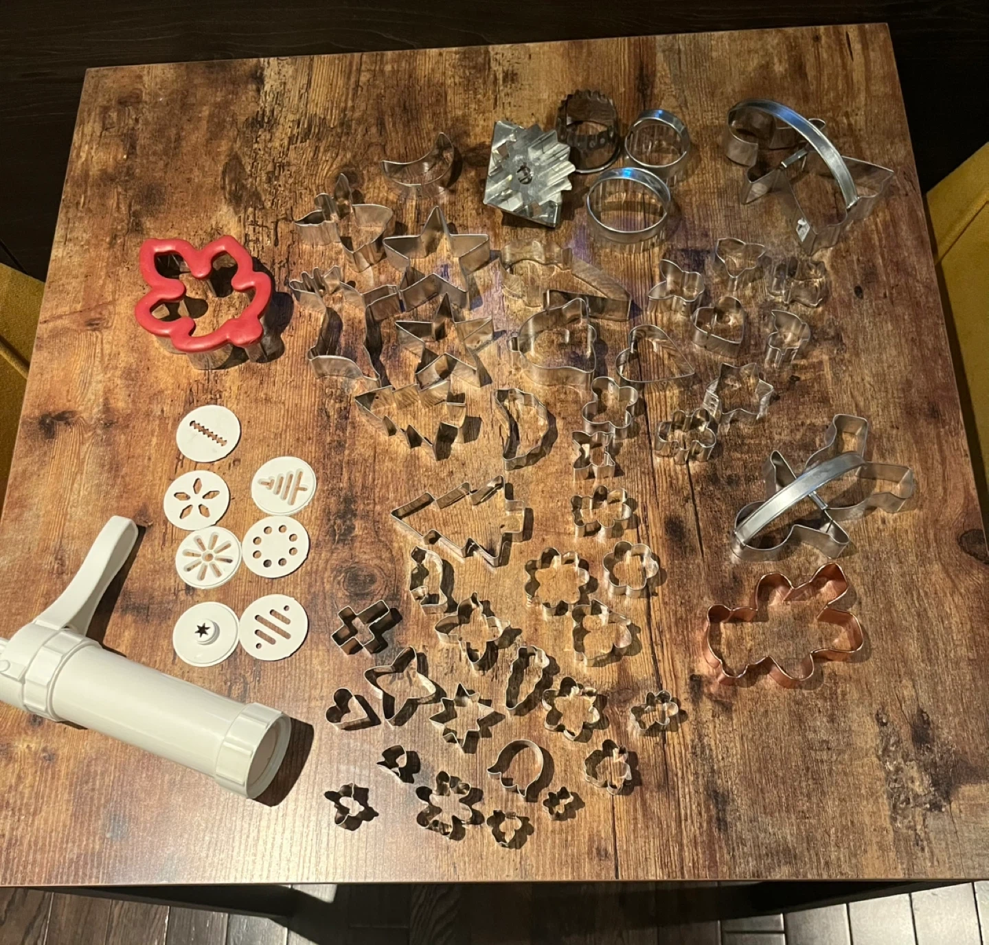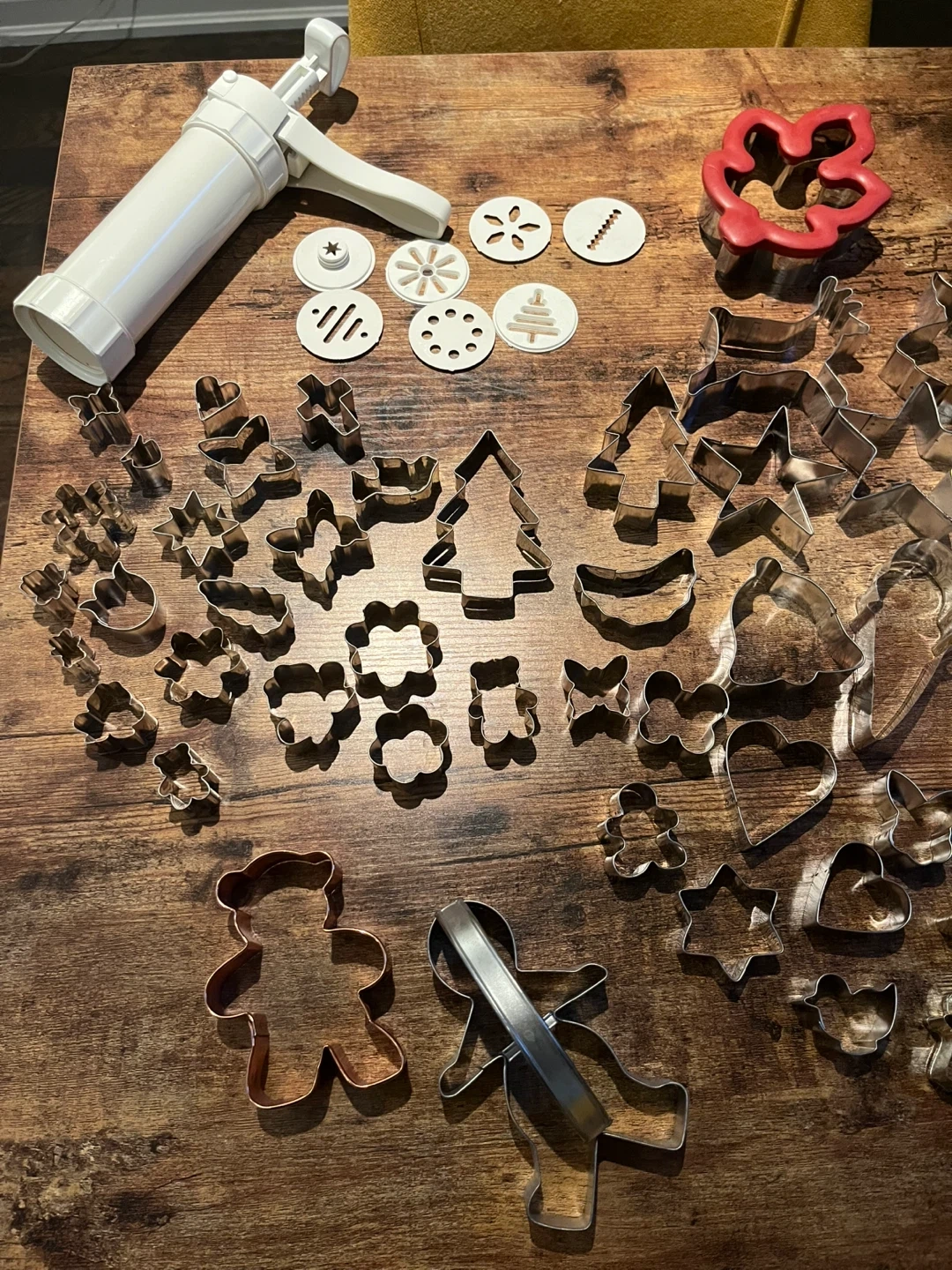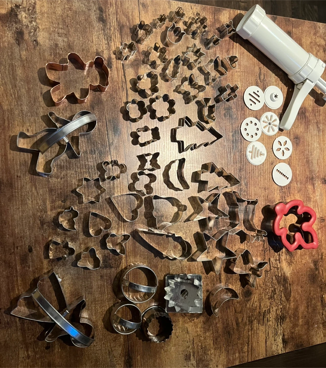A large set of cookie cutters in various shapes and sizes! Includes a cookie press with different pattern plates. Perfect for baking all sorts of treats