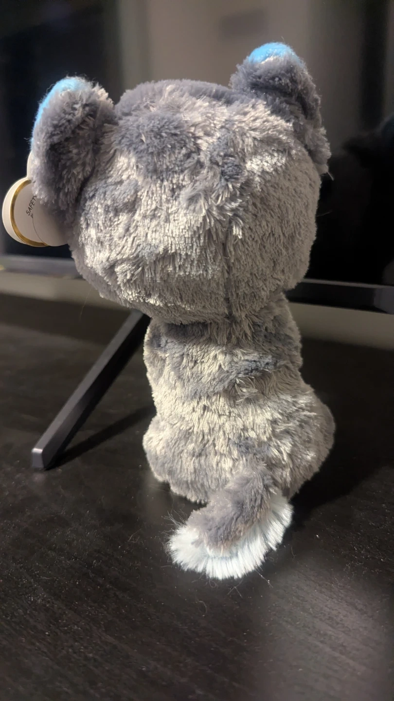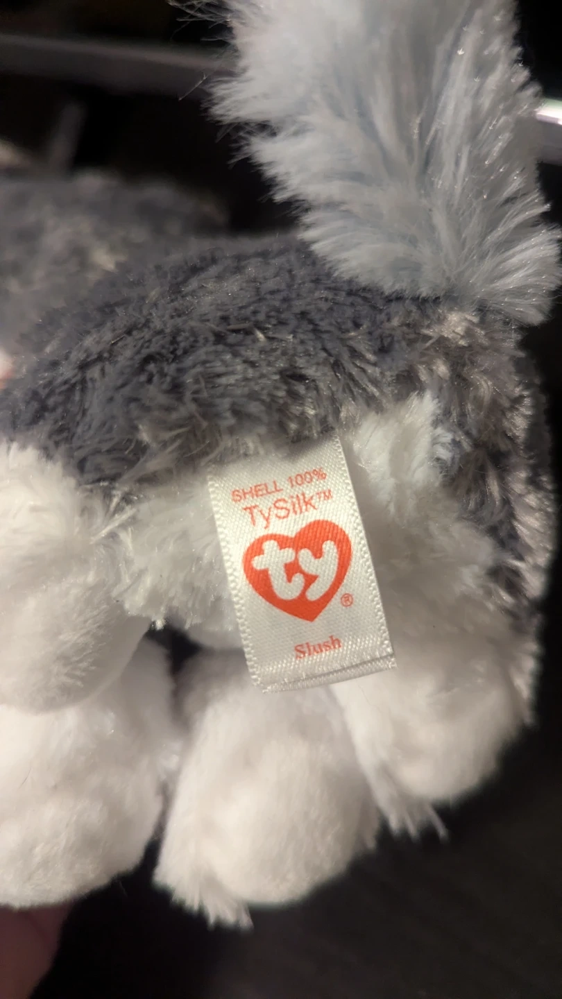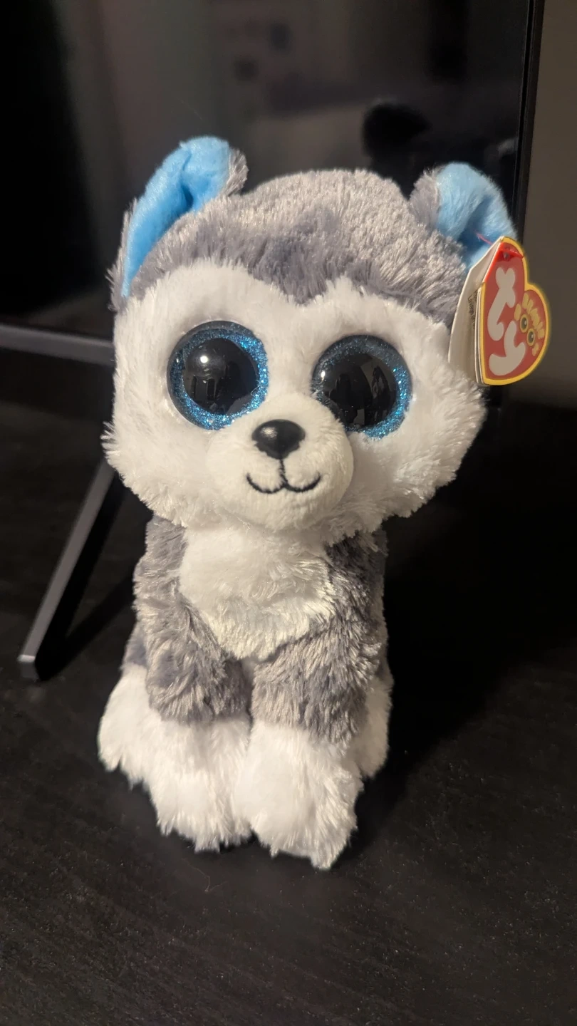 This is a cute Ty Beanie Boos plush toy named Slush! It's a husky with big, sparkly blue eyes and soft fur. The shell is 100% TySilk™️. It's in great condition and ready for a new home