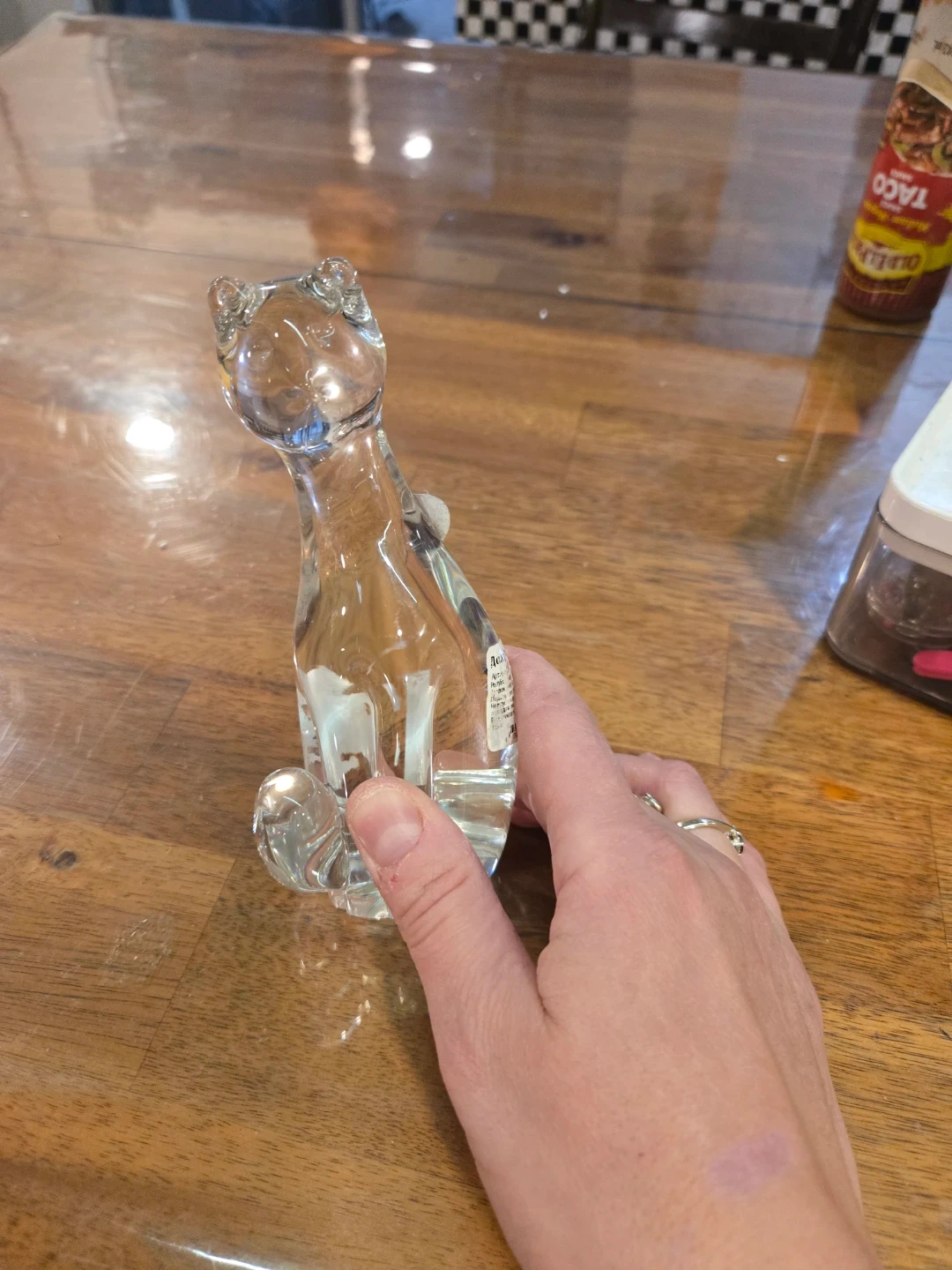 This is a cute clear glass cat figurine! It's in great condition and would look lovely on a shelf or desk.