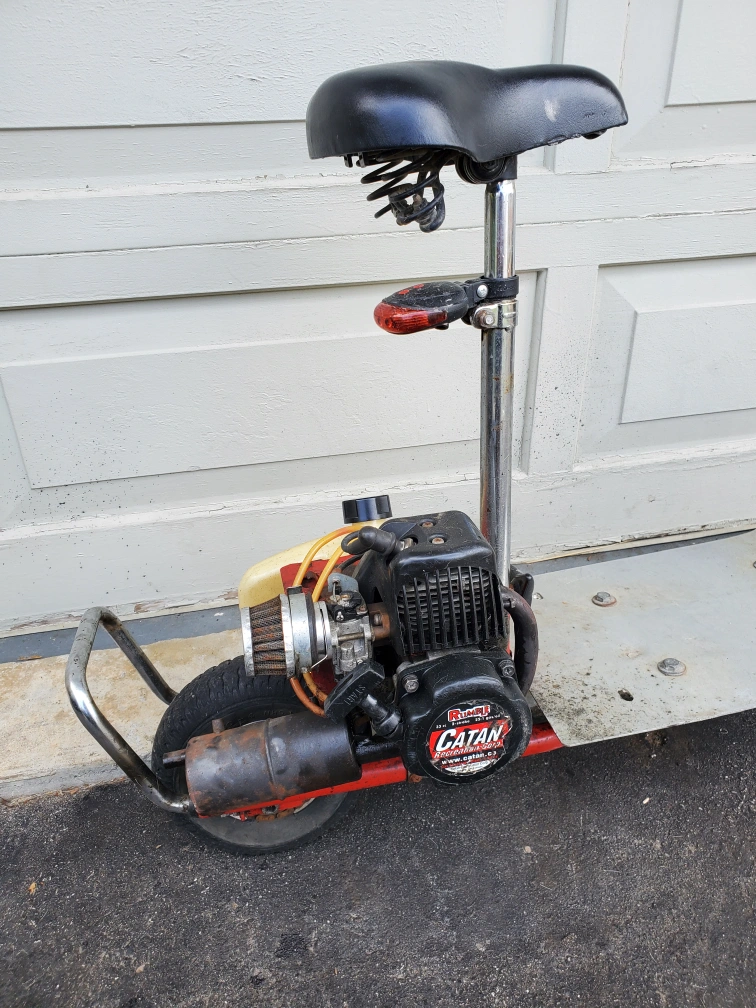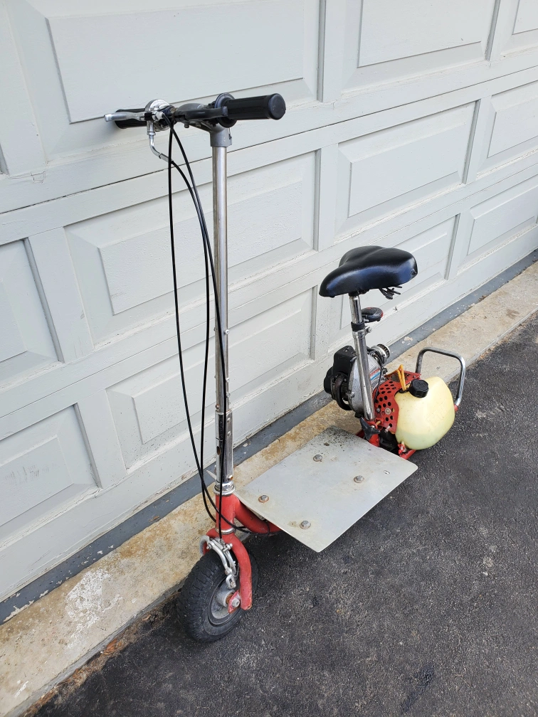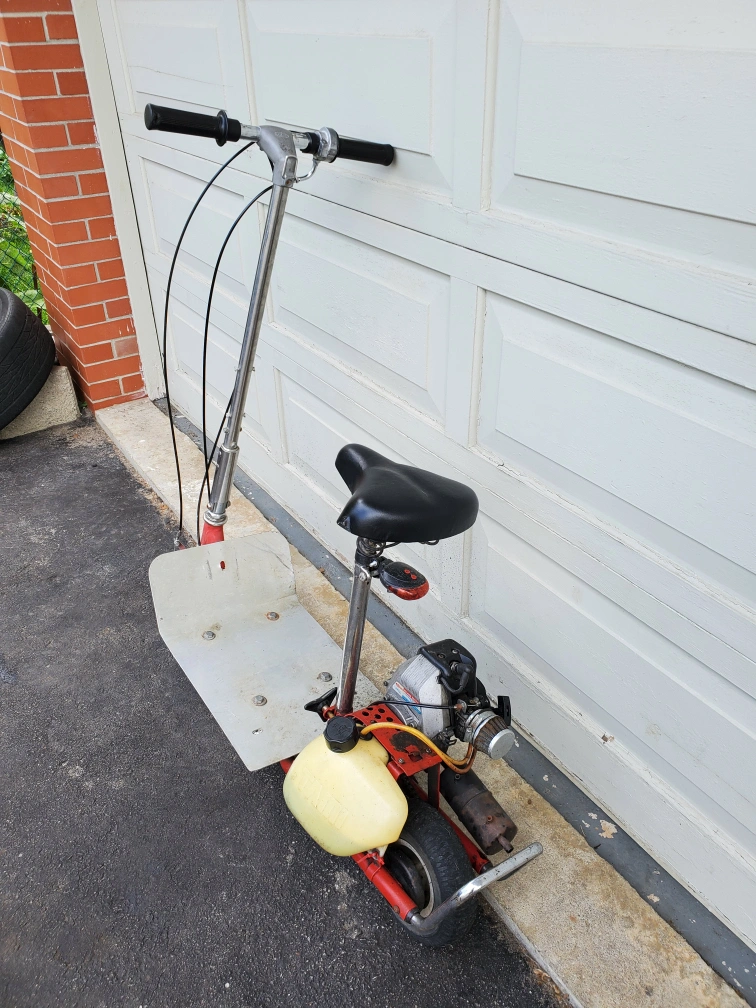 33cc gas scooter. Starts and runs perfectly. Only issue needs new exhaust. These have become pretty popular and easy to fix up with many aftermarket performance parts..