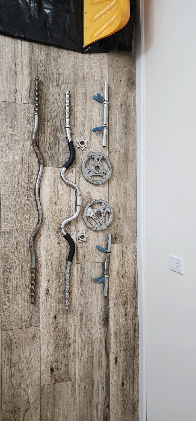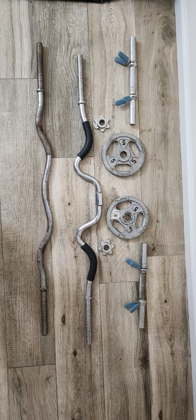 Selling a weight lifting barbell set. Includes 2 dumbells bars, 2 weight 5lb each plates, 1 super ez curl bar, 1 ez curl bar and collars. Good for home workouts!